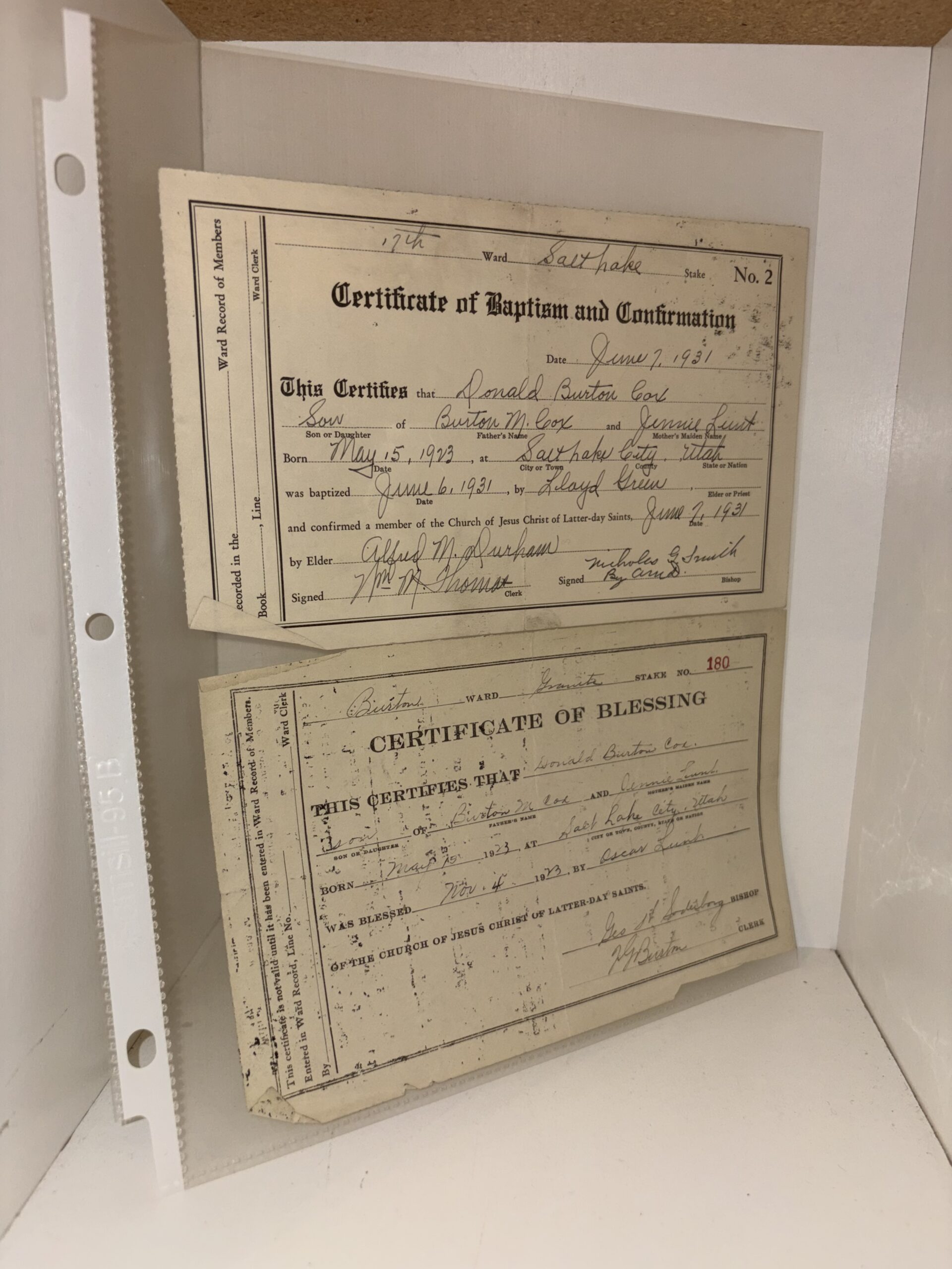 Ronald Burton Cox – 1923 LDS Blessing Certificate and his 1931 Baptismal Certificate