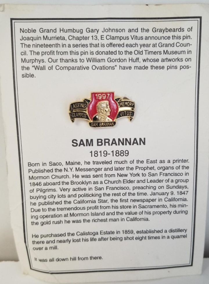 Sam Brannan 1819-1889 — Pin from the “Noble Grand Humbug, Johnson and the Graybeards of Joaquin Murrieta, Chapter 13, E Clampus Vitus” — #19 in a series offered each year…..