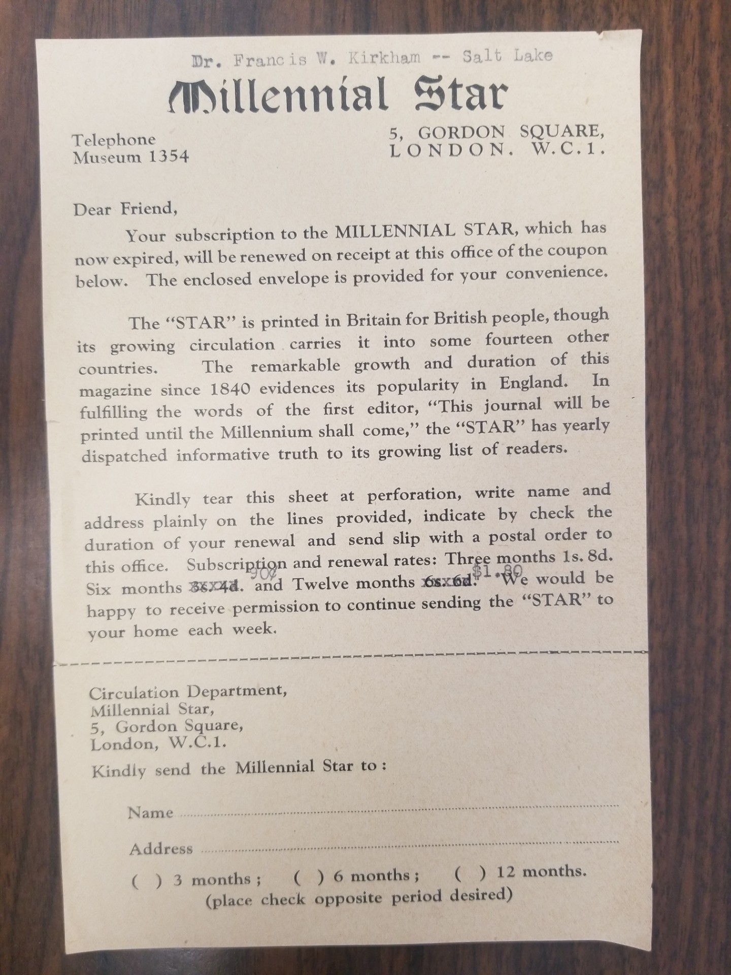 / Single Sheet Letter From the Millennial Star Office in London — To Dr. Francis W. Kirkham
