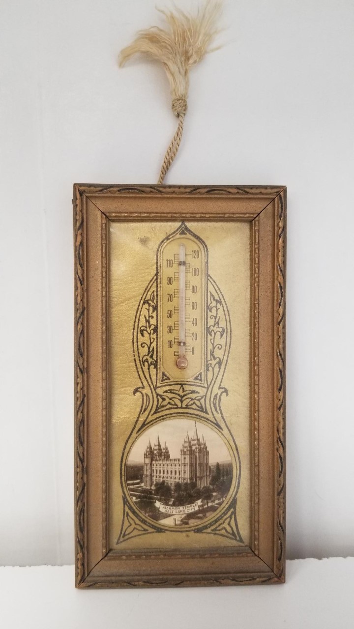 Around 3.5″x6″ framed little thermometer and picture of the “Mormon Temple, Salt Lake City.” With little tassel on the back, at the top.