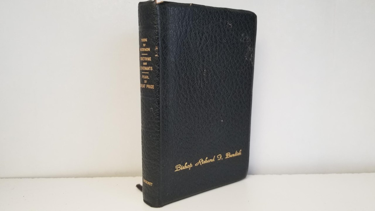 Smaller than 4″x6″. Black bendable leather binding; name engraved on front cover; sticker inside front cover. Looks like a child’s pencil doodling inside both covers, but in pencil. An articles of faith card tipped in, in front of the title page. The text seems clean throughout; binding in good condition.