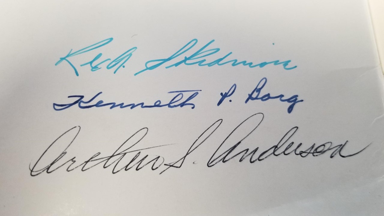 1962, Deseret Book. Booklet; good condition; ink inscriptions inside the front cover; signed by three people, including Rex Skidmore.