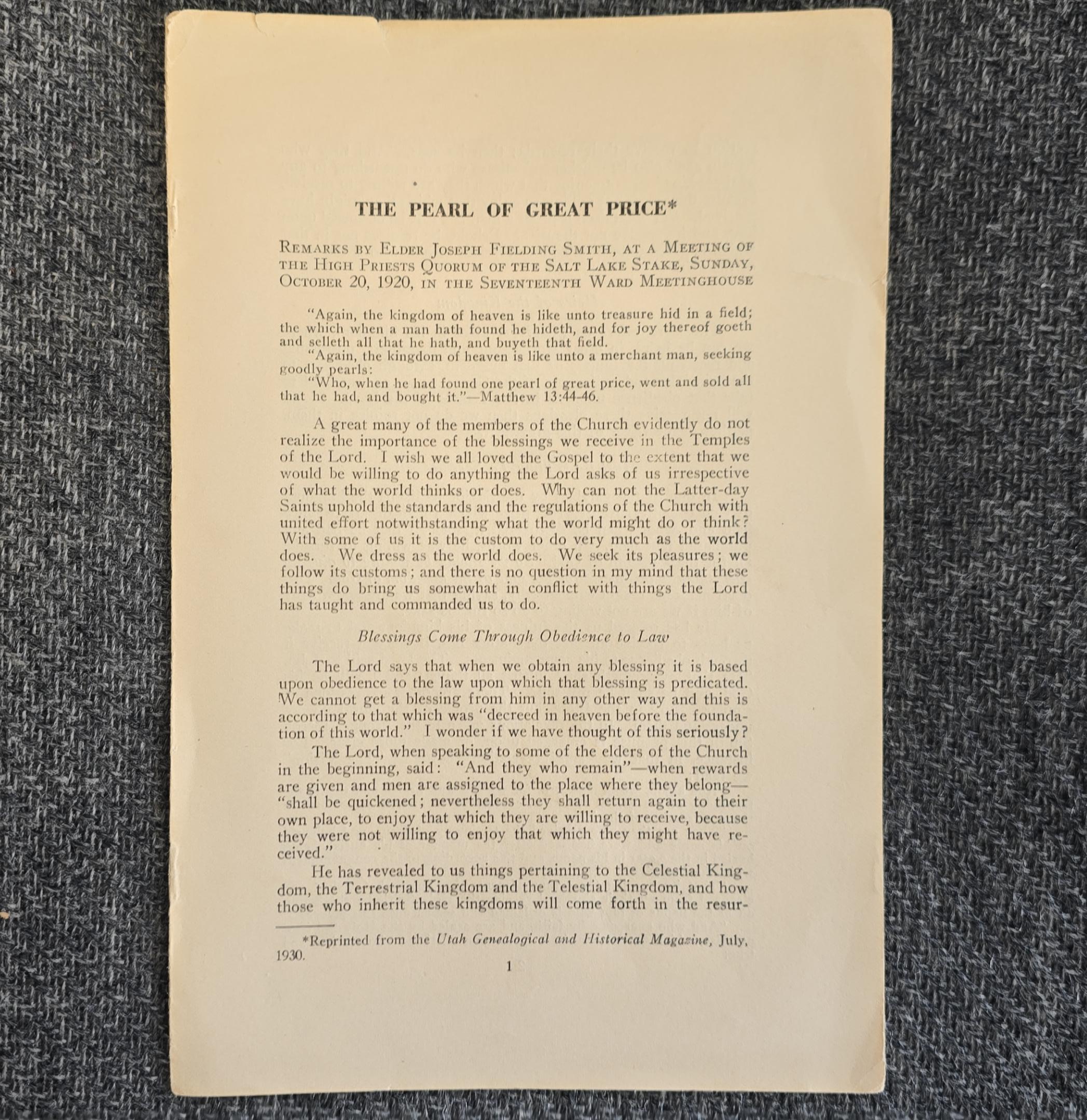The Pearl of Great Price – Remarks by Elder Joseph Fielding Smith, at a Meeting of the High Priests Quorum of the Salt Lake Stake, Sunday, October 20, 1920, in the Seventeenth Ward Meetinghouse
