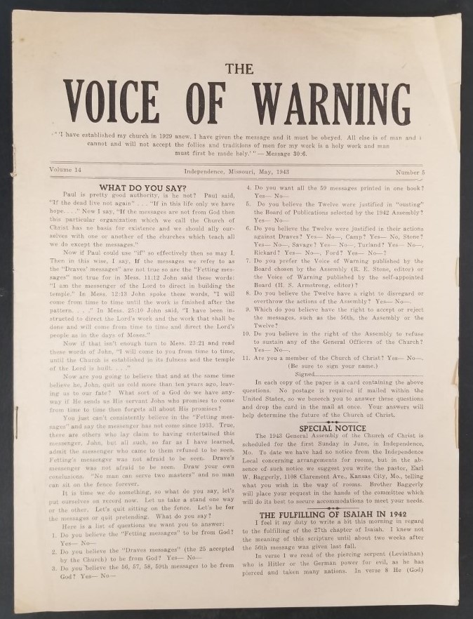 The Voice of Warning, Volume 14, Number 5, May 1943 — [Church of Christ – Independence, Mo.] — Single Issue