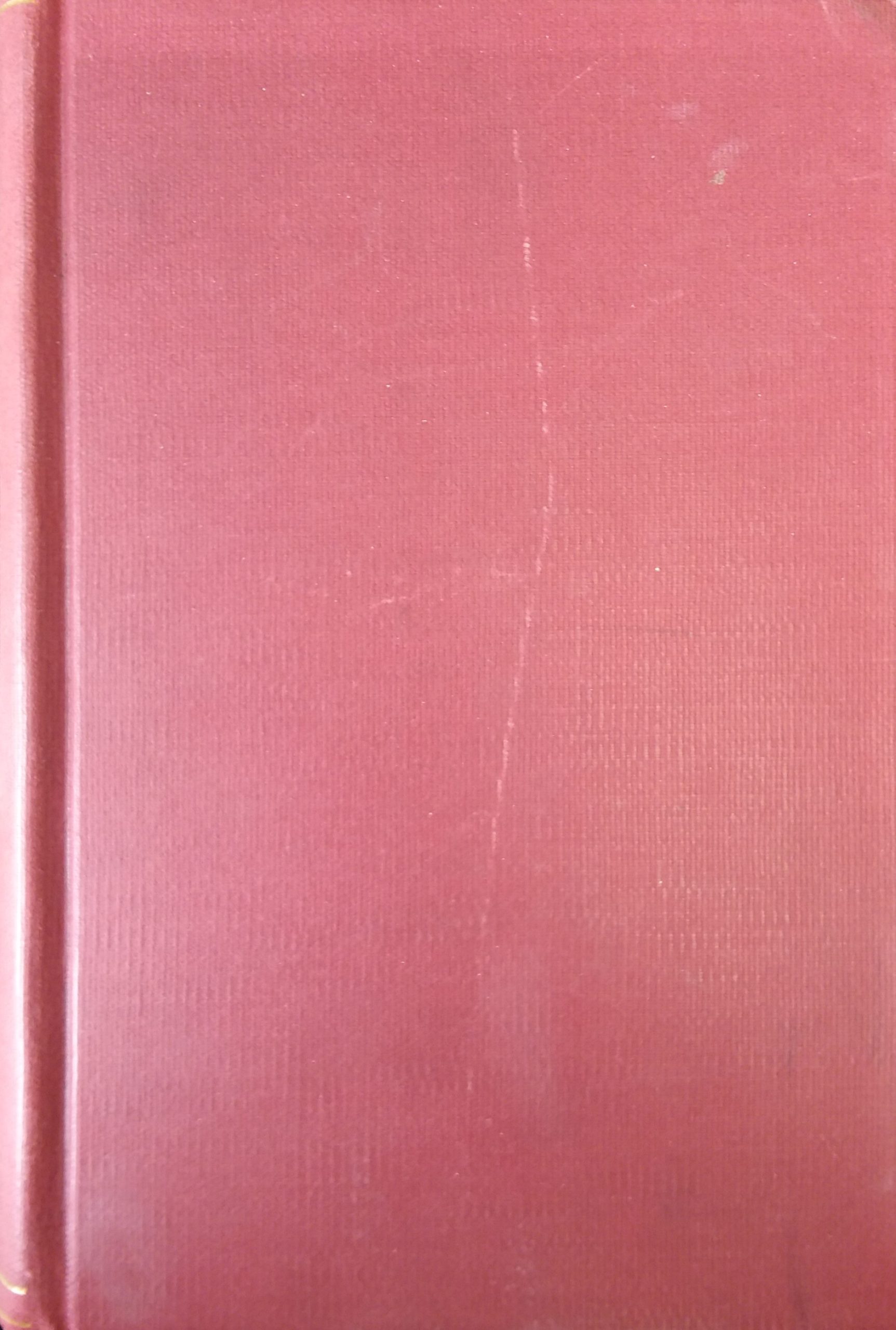 Red hardcover with gold lettering on the spine. Some scuffs and smudges on both covers and on the spine. Scratches and discoloration due to age. Pen markings on the spine. Pen and pencil markings on the inner front cover and the spine. A sticker on the inside front cover. The text throughout is clean, clear, and legible. In fair condition.