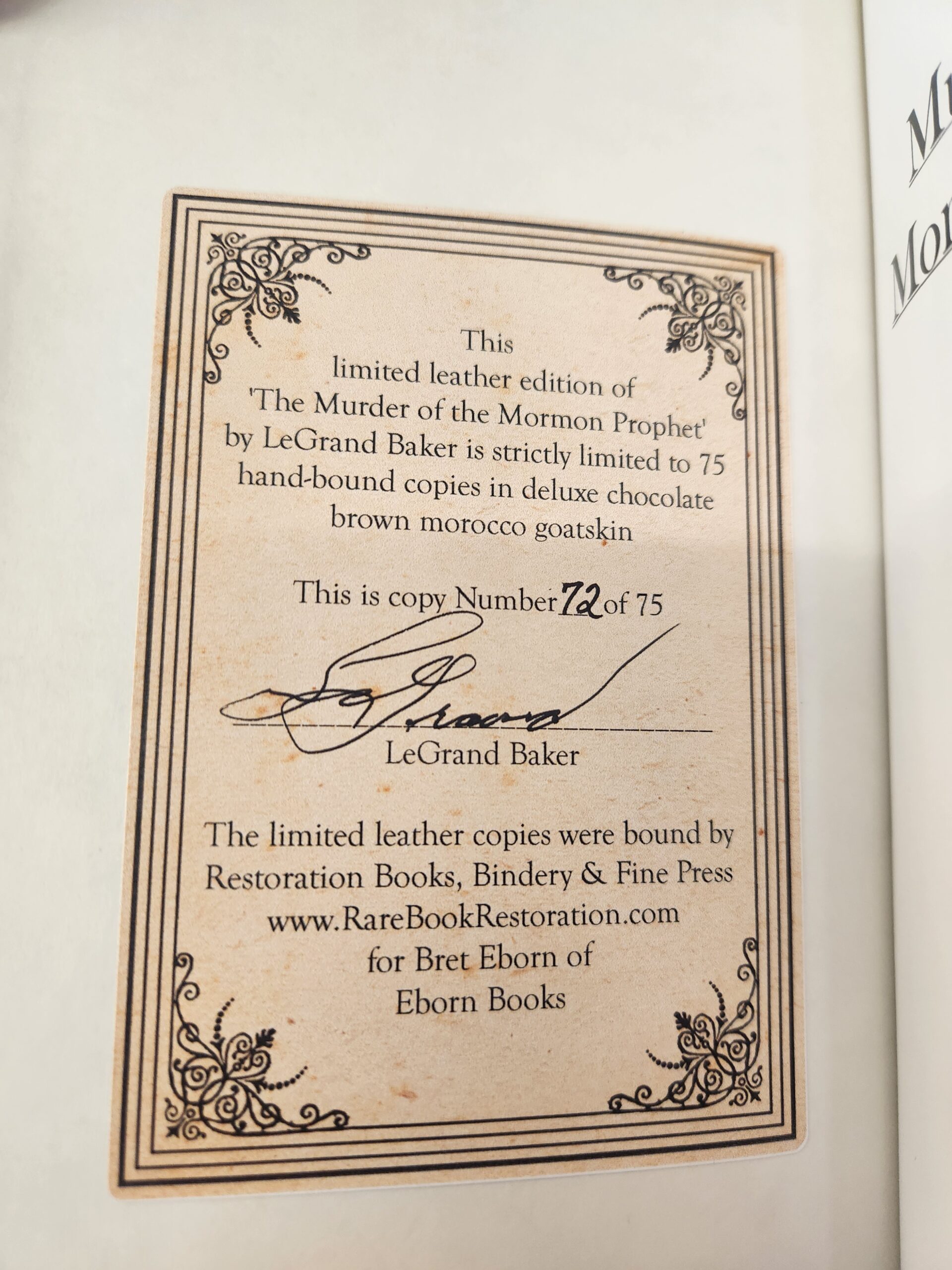 Murder of the Mormon Prophet (2006, Hard Cover Leather, Limited Leather Edition) No marks or writing on pages. Number 72 out 75 (limited edition), see picture in photo gallery. Corners and edges show minimal to not shelf wear. Binding is good.