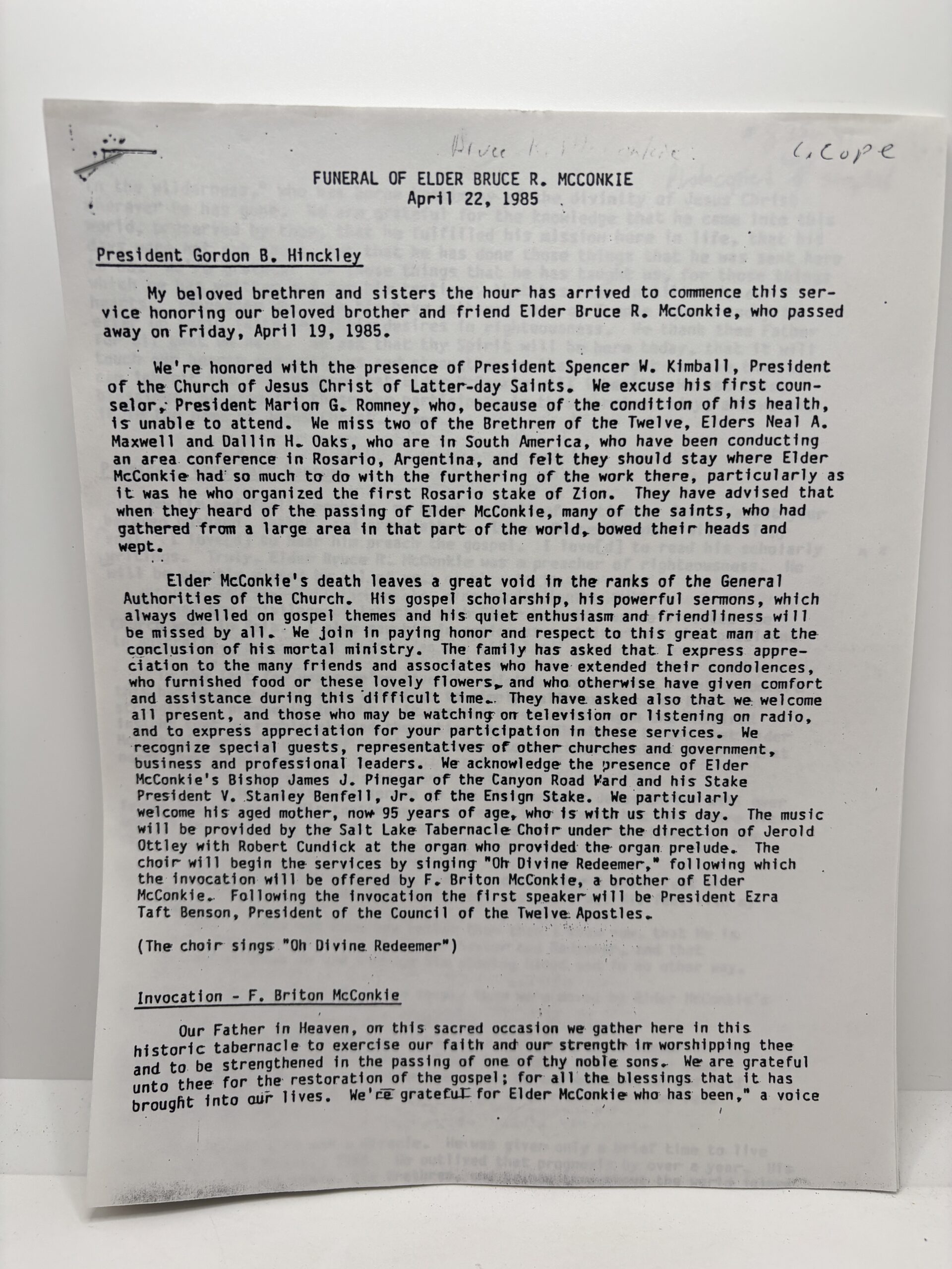 Photocopy of the Funeral of Elder Bruce R. McConkie April 22, 1985