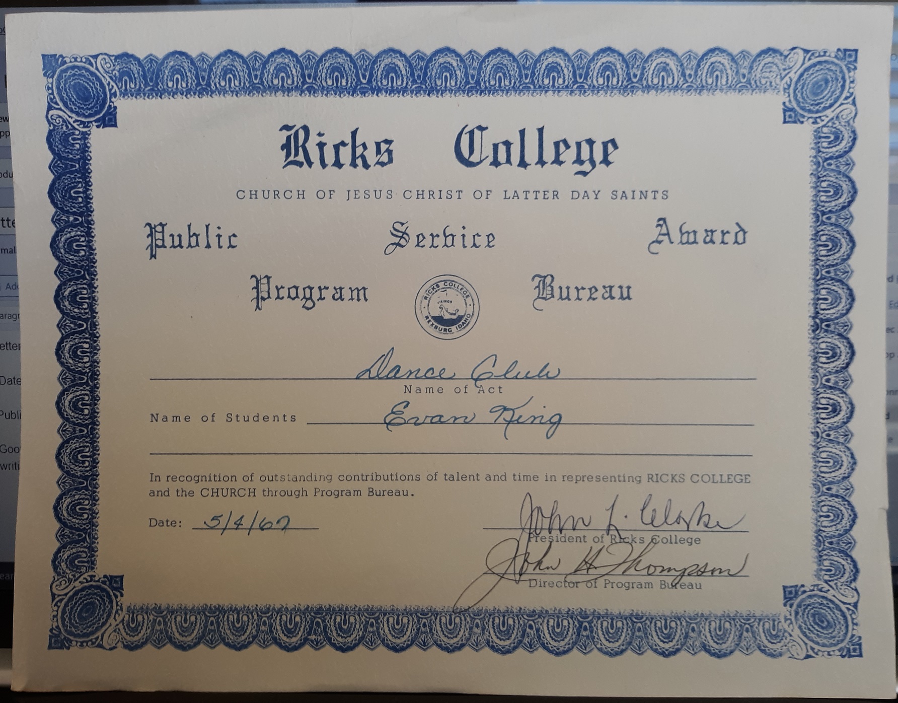 Ricks College Public Service Award Certificate for Evan King
