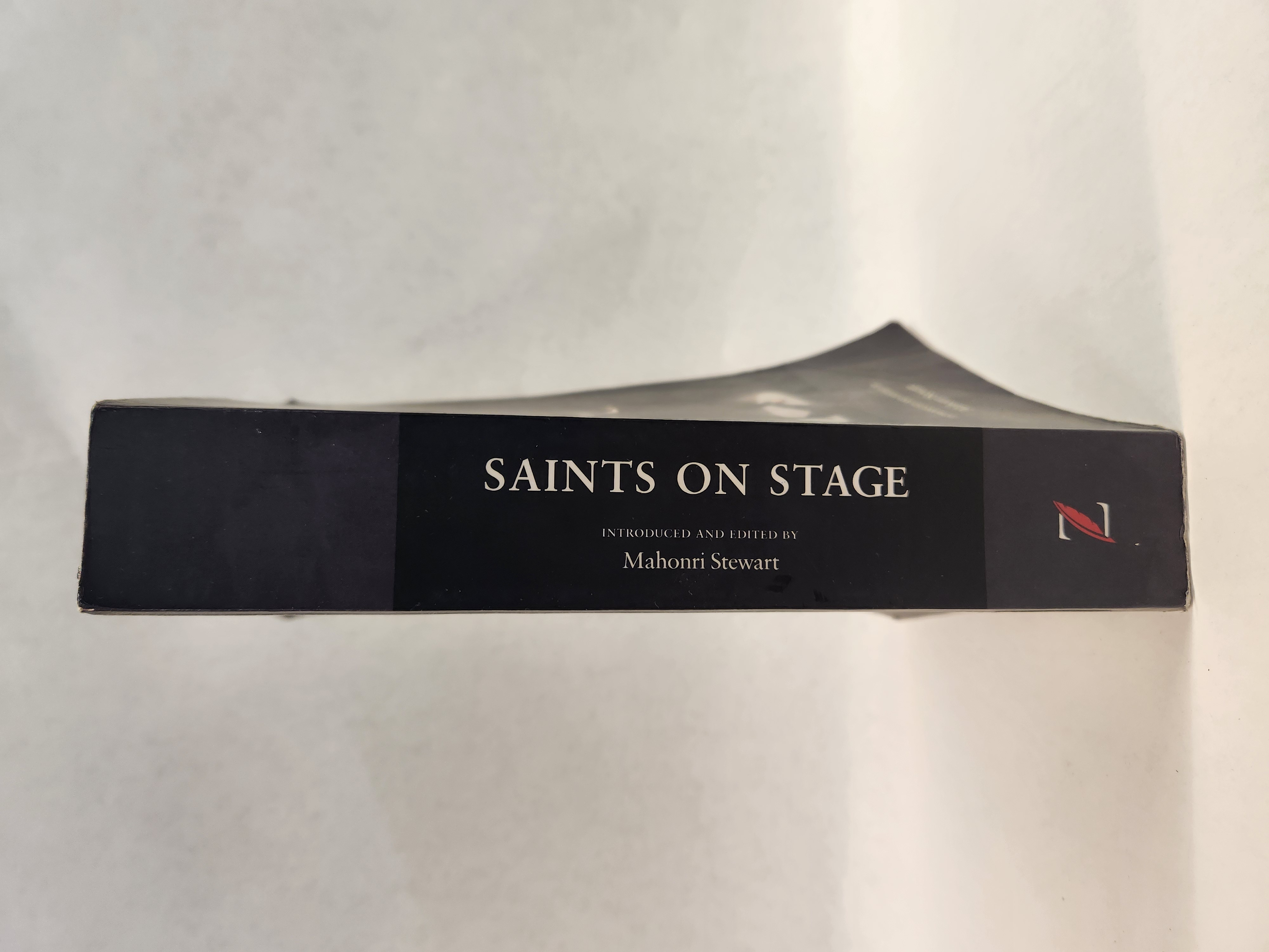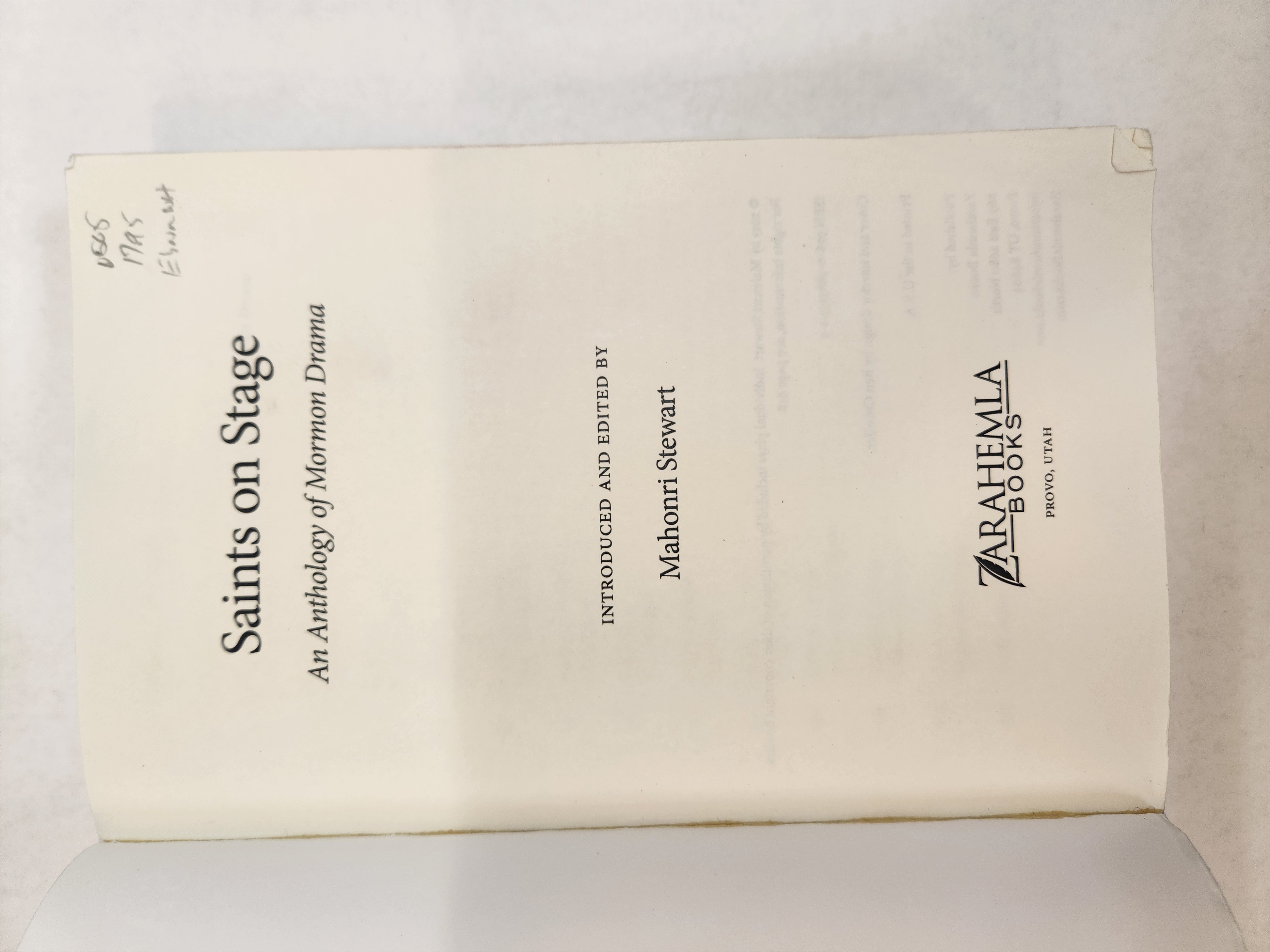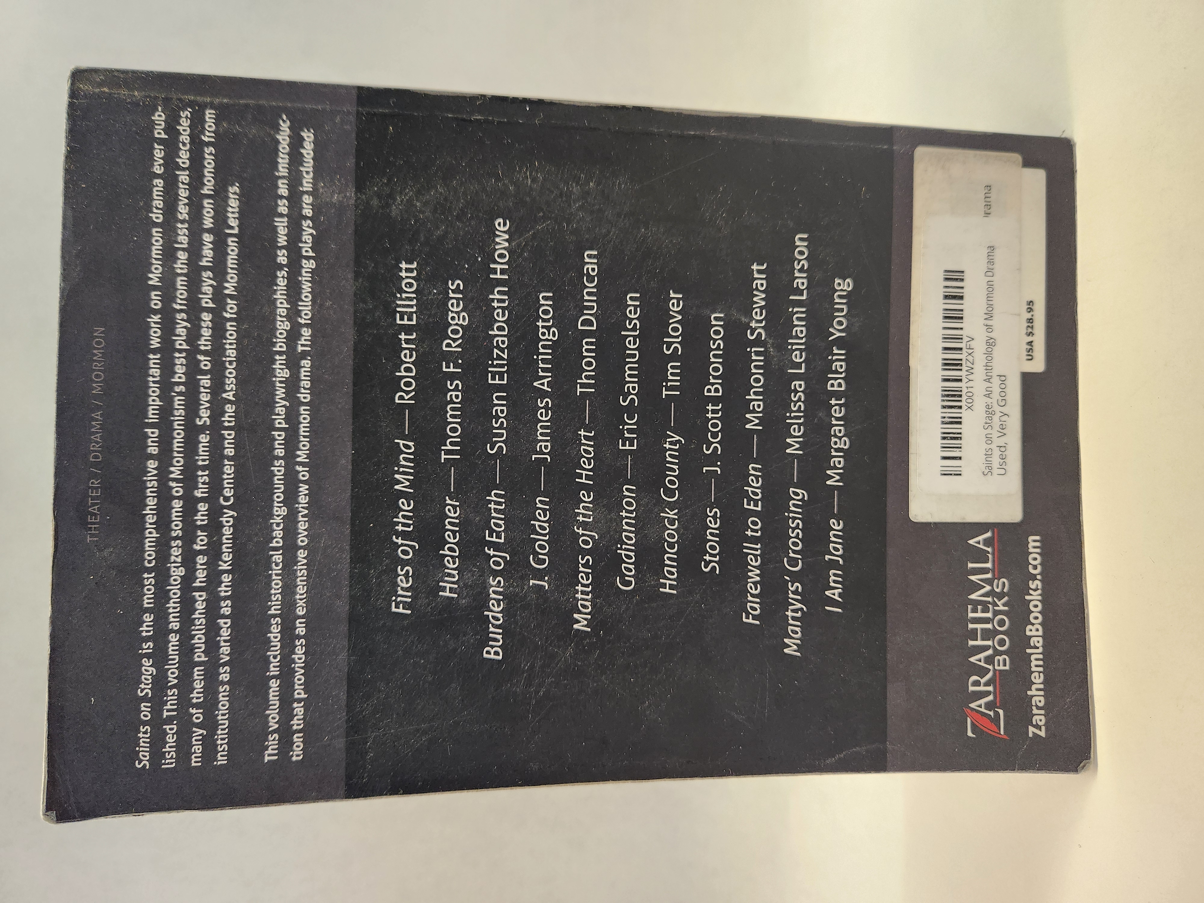Saints on Stage:: An Anthology of Mormon Drama (2013, Paperback) There are some annotations written in pencil (see pic in gallery for example). Binding is good. Corners and edges show shelf wear with bend, scuff, and smudge marks. Front cover bottom corner has a couple diagonal bend marks also a slight bend that marks the cover not lie flat. Back cover has a couple selling stickers on the bottom portion. Both front and back cover have some light scratch marks and smudge marks.