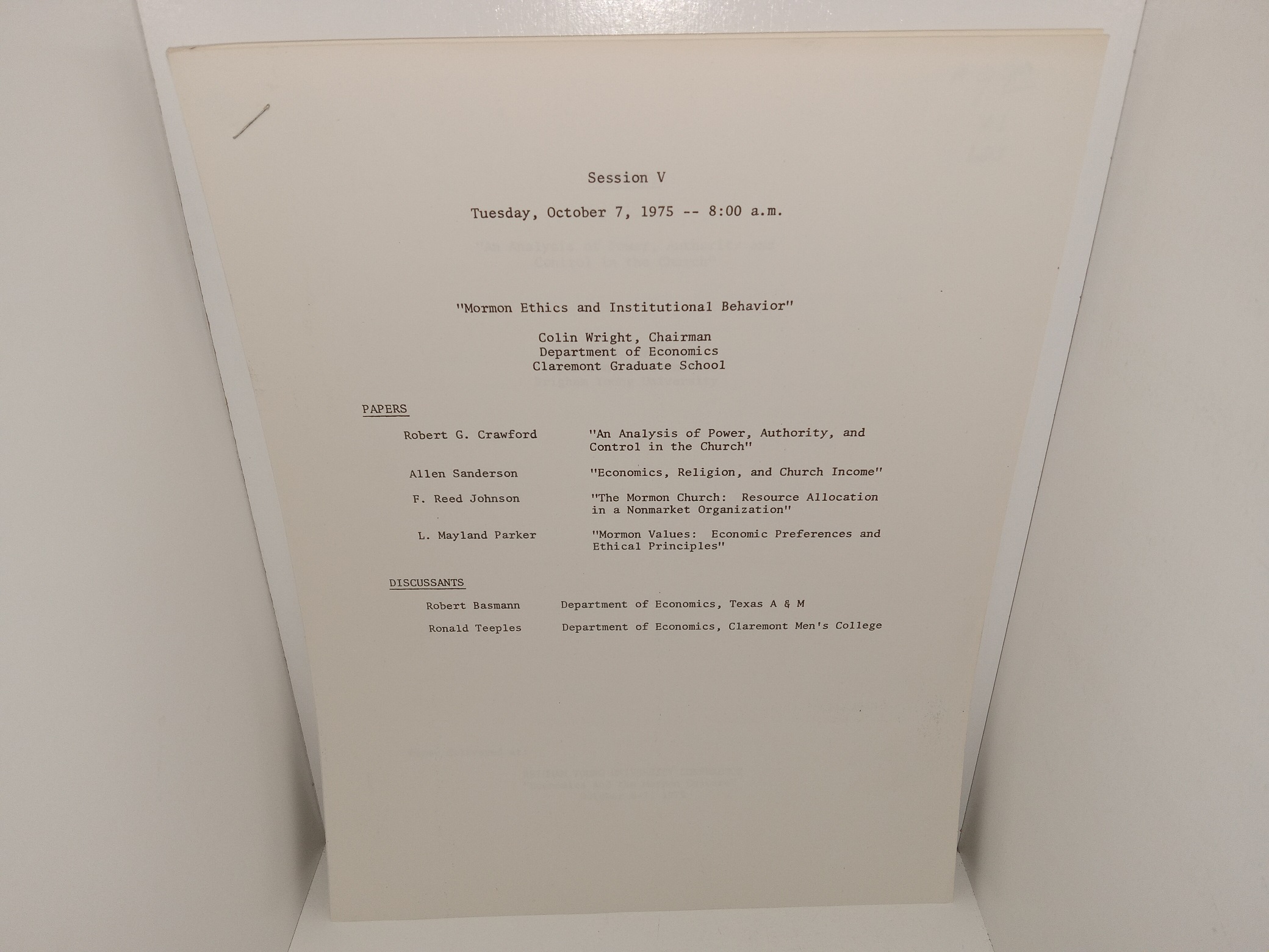 Session V: Tuesday, October 7, 1975 — 8: a.m.: “Mormon Ethics and Institutional Behavior”