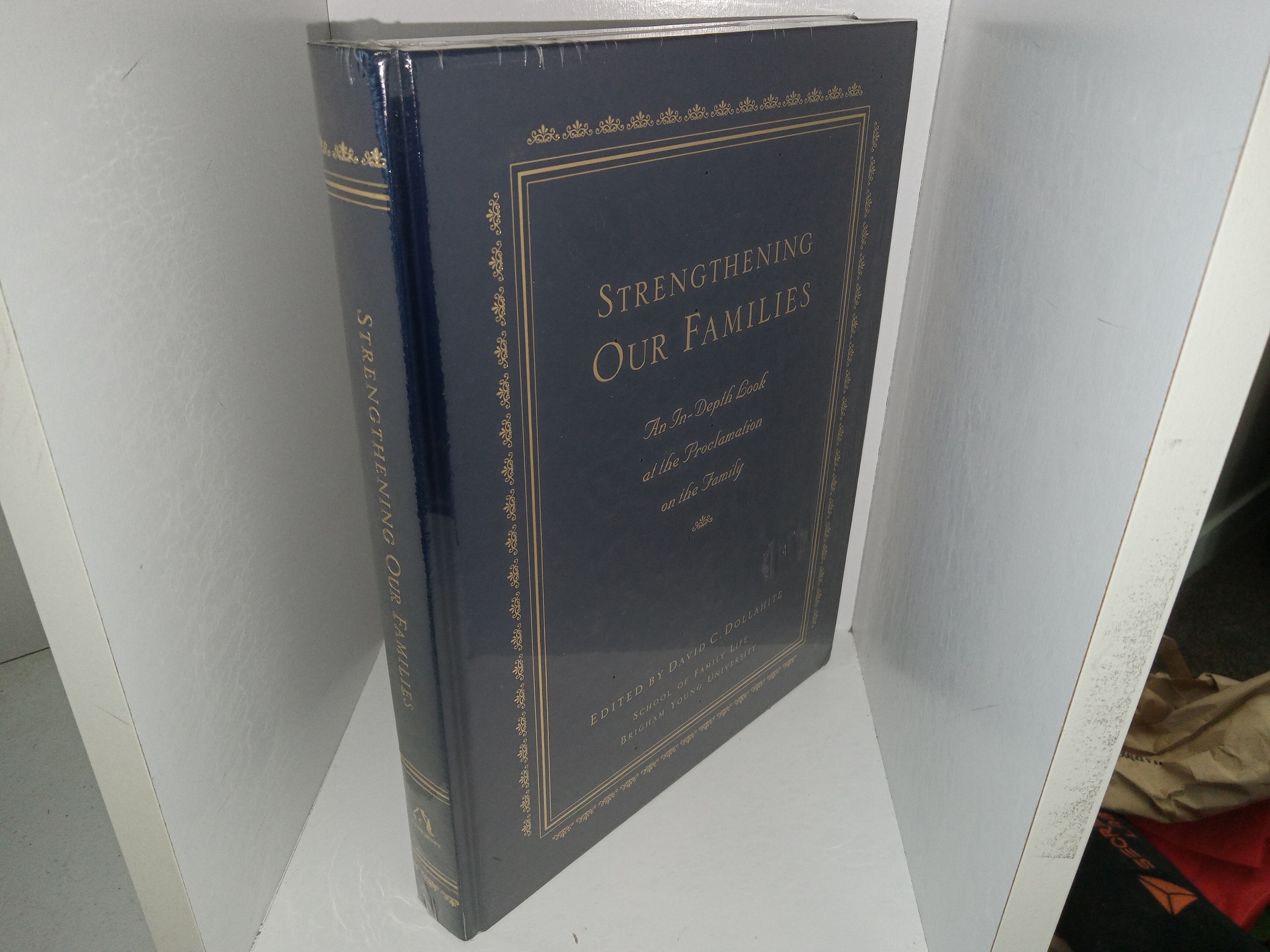 Brand new, large, dark blue hardcover with no dust jacket, kept withing its original plastic wrap. The plastic wrap has a long tear where the outer edges of the pages are, and some of these edges have small stains. The cover has some crushed corners from storage.