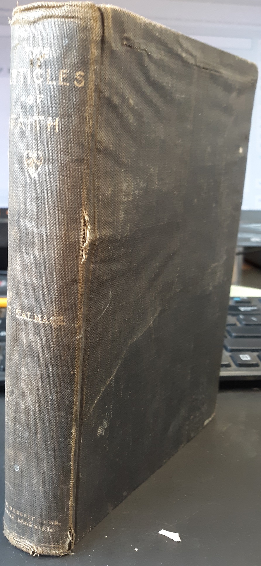 Fair condition, blackish, hardcover with no dust jacket. The cover has wrinkles, tears, scuffs, and color fading. The internal binding is torn. The fly leaf has tape residue, an inscription from a previous owner in black ink, and some pencil marks. The back inside cover and the back fly leaf have stains…………………………….v1 Bx733