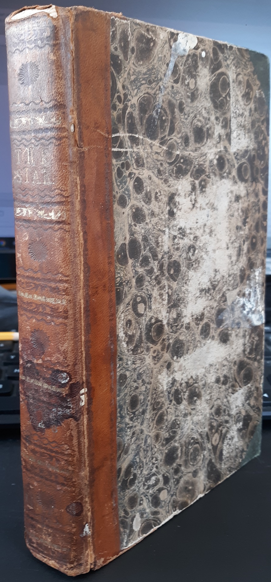 Fair condition 1/2 leather book with a brown leather spine. The cover has stains, scuffs, scratches, the edges are torn and frayed. Several pages have stains. The fly leaf has some pencil marks…………………………………………….v707 Case M5