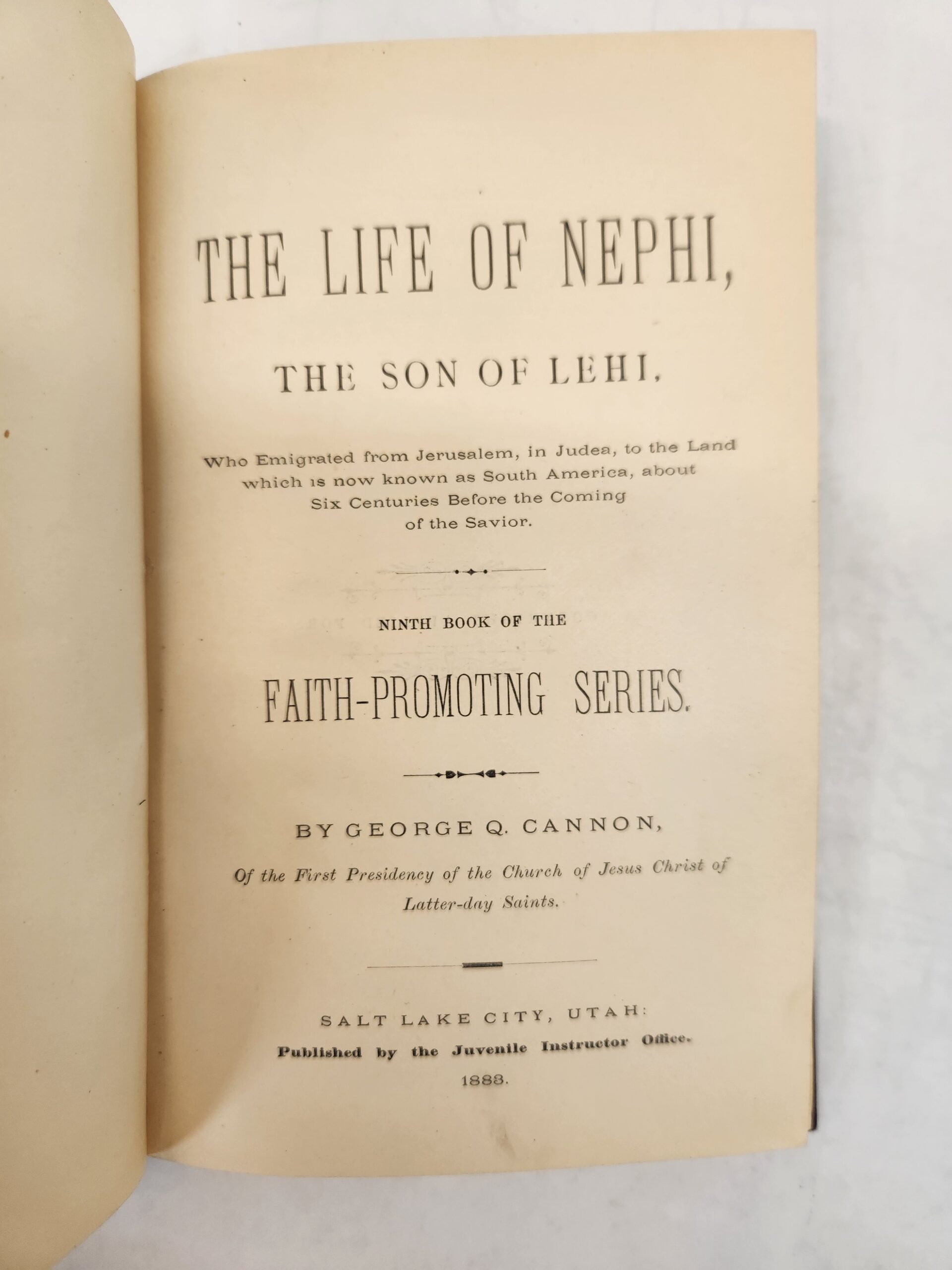 The Life of Nephi (Hardcover, 1883) No writing or marks on pages, except for an inscription on the first blank page (see pic in gallery). Binding is good but starting to weaken (see pic in gallery for example). Corners and edges show moderate shelf wear with scuffs, dents/bend marks, and light scratch marks. Cover, front and back, has some light scratch and smudge marks.