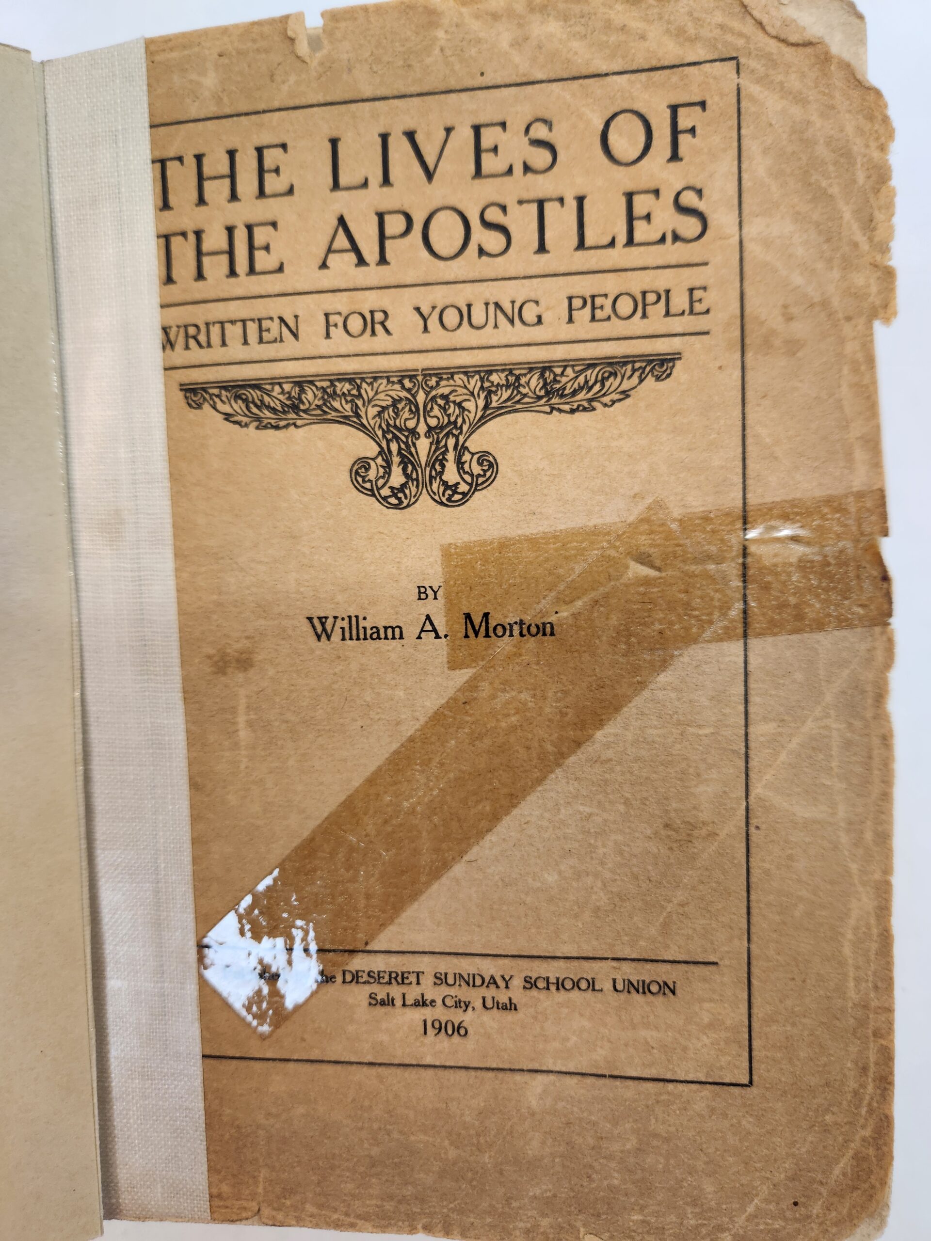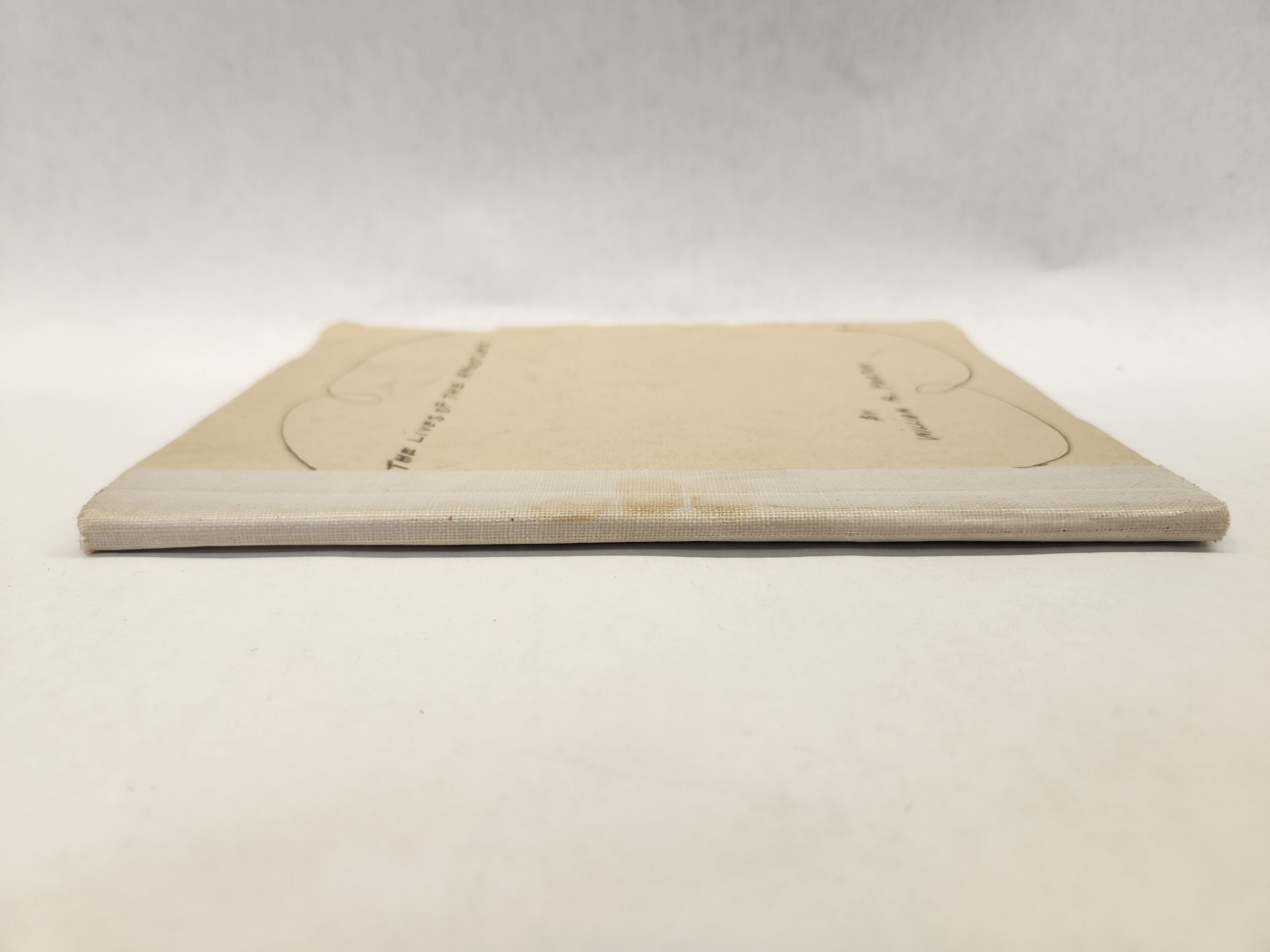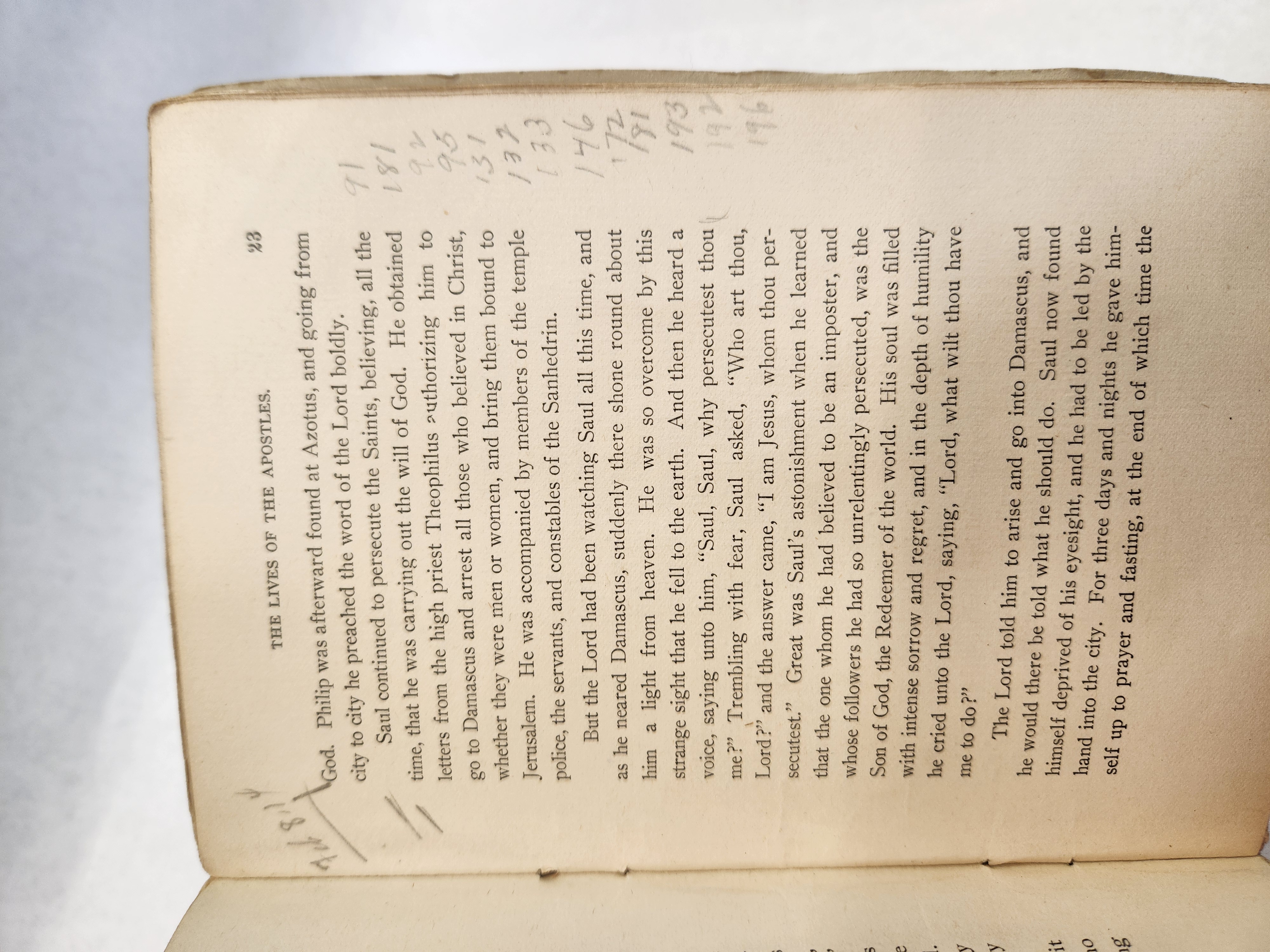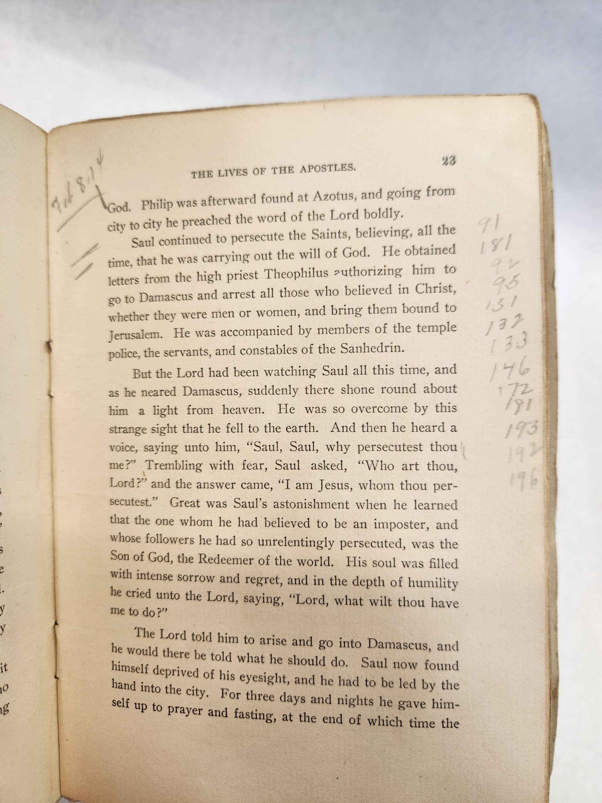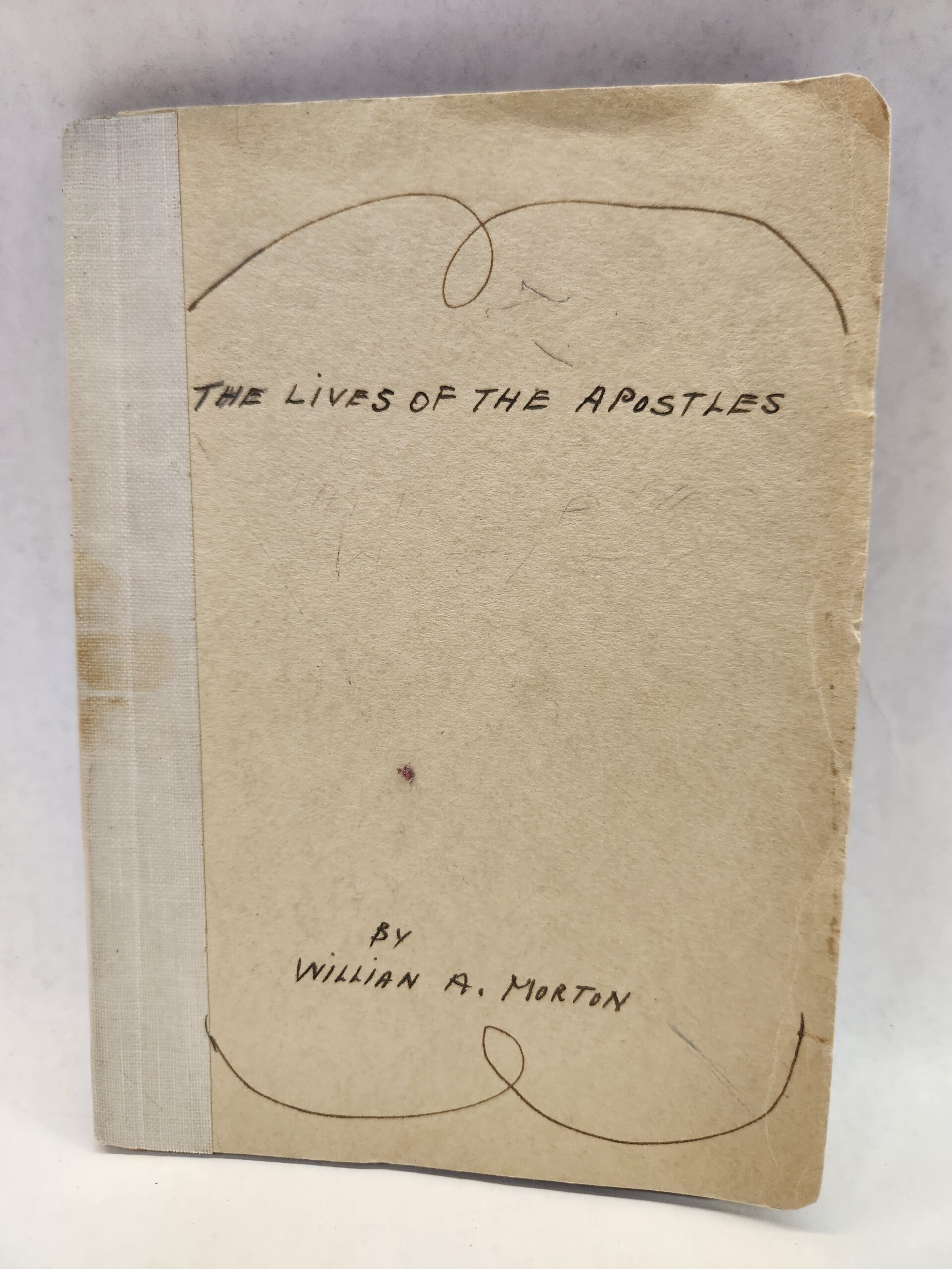 The Lives of the Apostles (1906, Paper-bound) Some annotations in pencil throughout the book. Binding is loosening (see picture in gallery for example). Corners and edges show shelf wear with bends and scuff marks. Cover, front and back, has some pencil marks and smudge marks. Cream cloth bound with no words on spine.