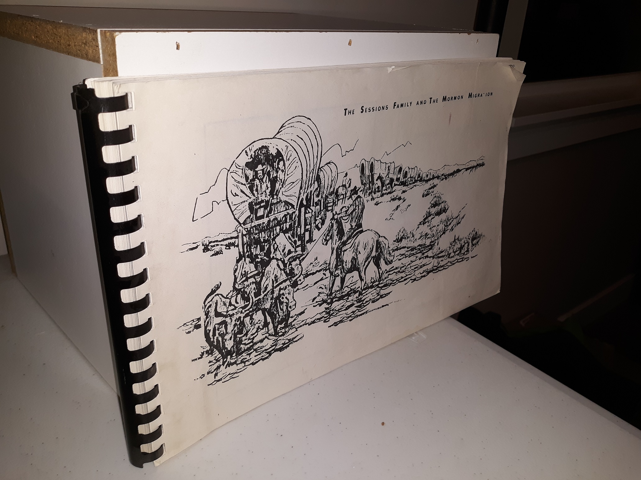 Fair condition, large, oblong softcover with a black comb binding. The cover has some stains, creases, some tears, small pieces torn off, and some wrinkling. Some pages have creases. The first page has writing in pencil and eraser marks. Text and illustrations throughout are clean, clear, and legible.