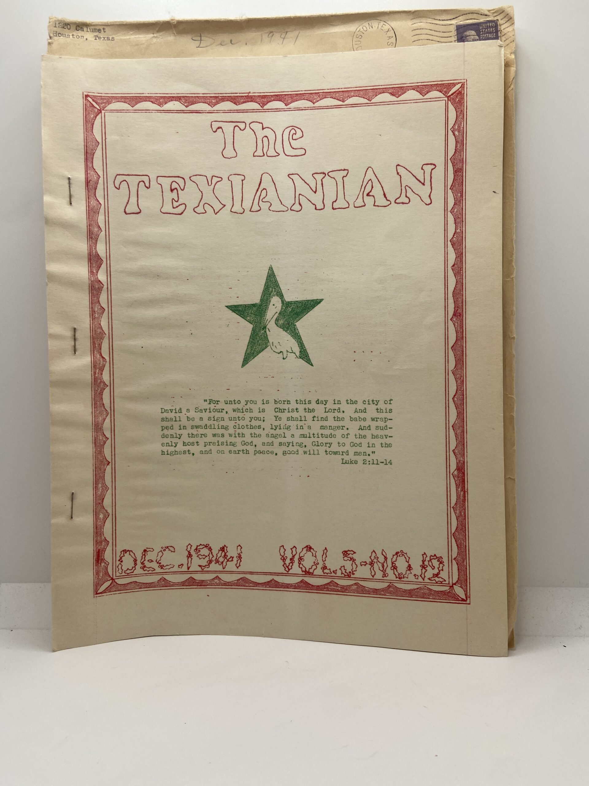 Fair condition. Construction paper covers. Staple bound. Some water damage. Stains on the front cover. Small tear at the top. Clean, typewritten text.