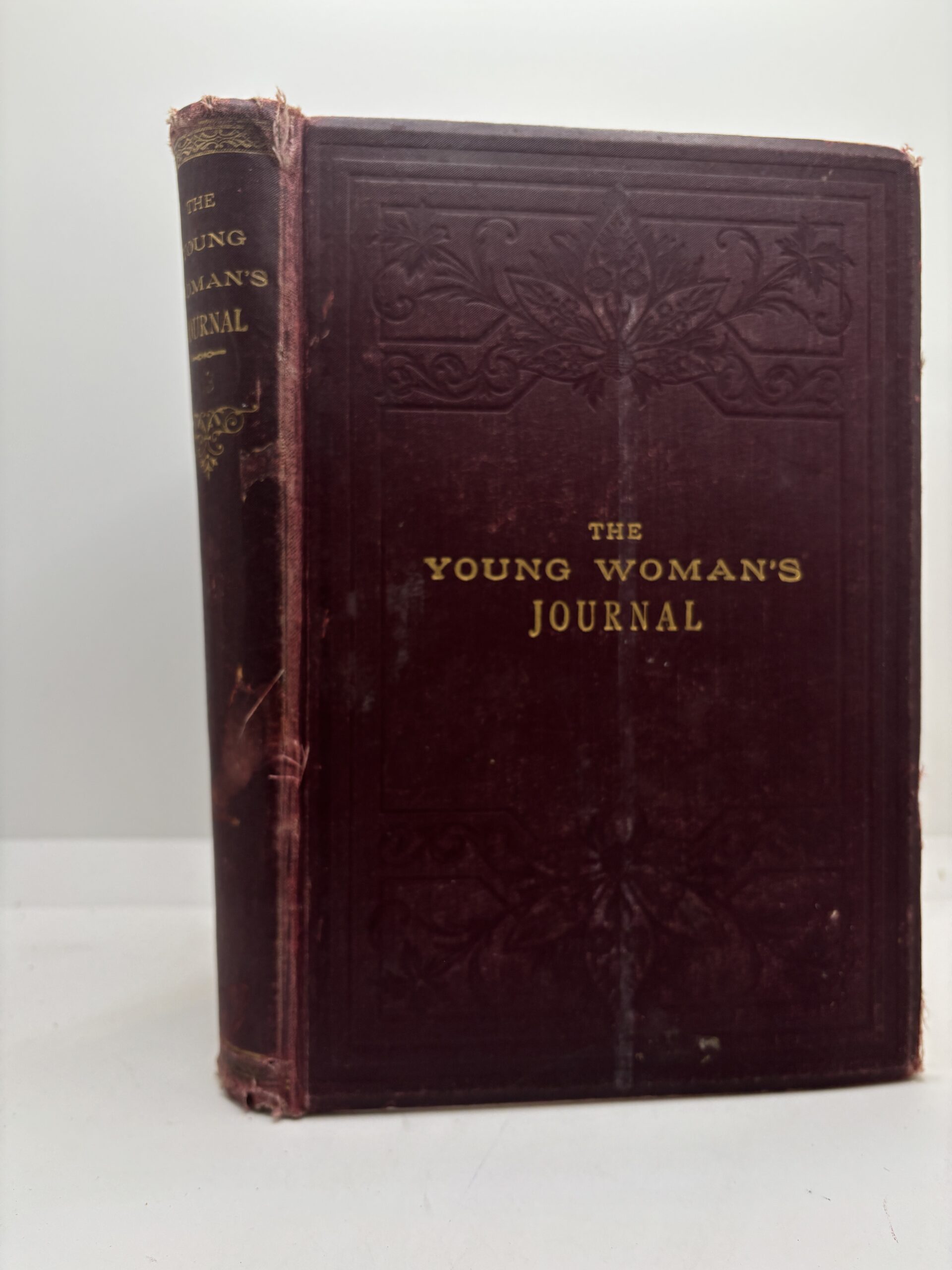 Poor condition hardcover with gold embossed letters. First two pages have detached. Fraying around the corners. Blemishes, fraying, and bending on the spine. Worn page edges with some staining. No markings on the text.