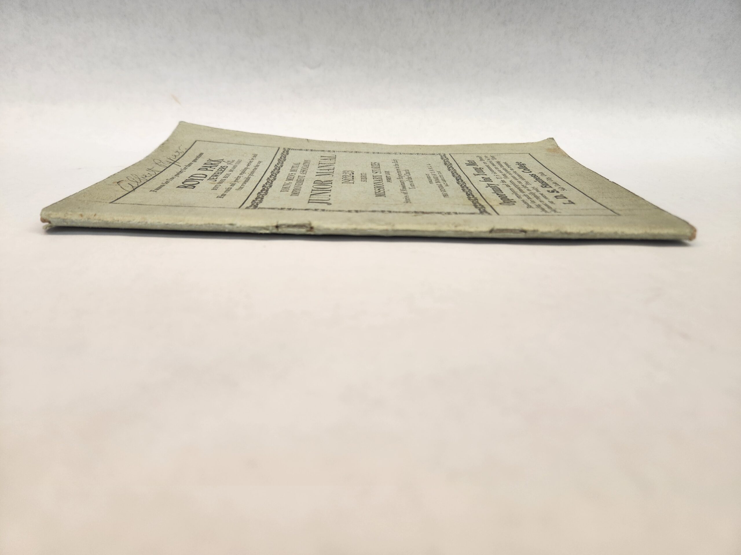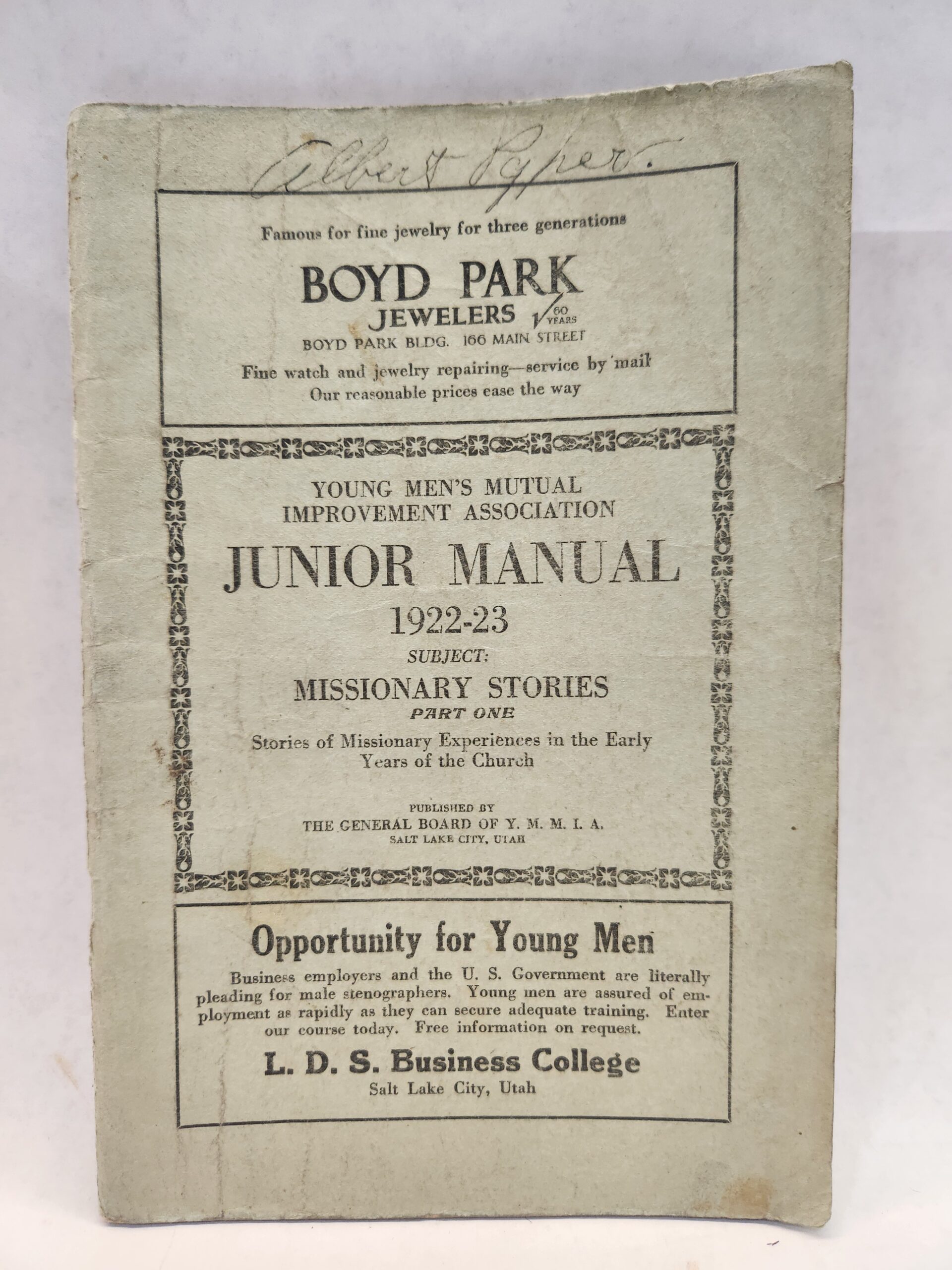Young Men’s Mutual Improvement Association:: Junior Manual, 1922-23, Subject: Missionary Stories, Part One, Stories of Missionaries Experiences in the Early Years of the Church (1922, Paper Staple Bound) Only writing/marks is a name written in pen on the cover and a small date written in pencil on the first page. Binding is good. Corners and edges show wear with scuff marks, small tears, bend marks, and smudge marks. Cover, front and back, has smudge marks, bend marks, and scuff marks.