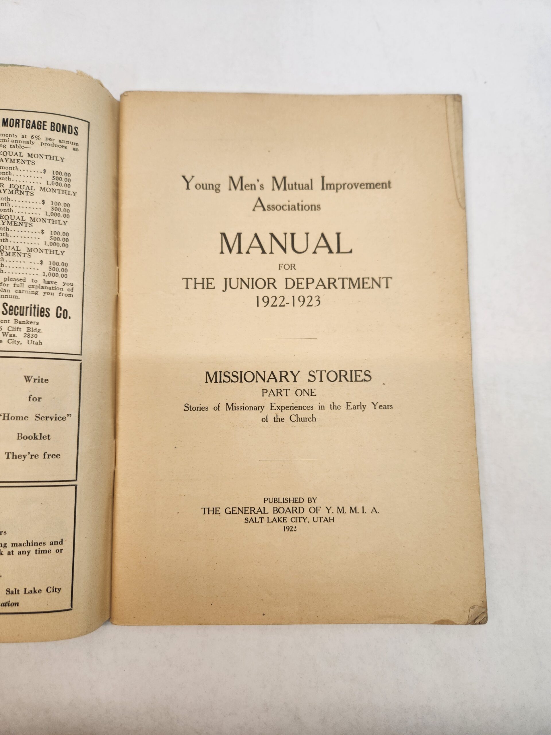 Young Men’s Mutual Improvement Association:: Junior Manual, 1922-23, Subject: Missionary Stories, Part One, Stories of Missionaries Experiences in the Early Years of the Church (1922, Paper Staple Bound)