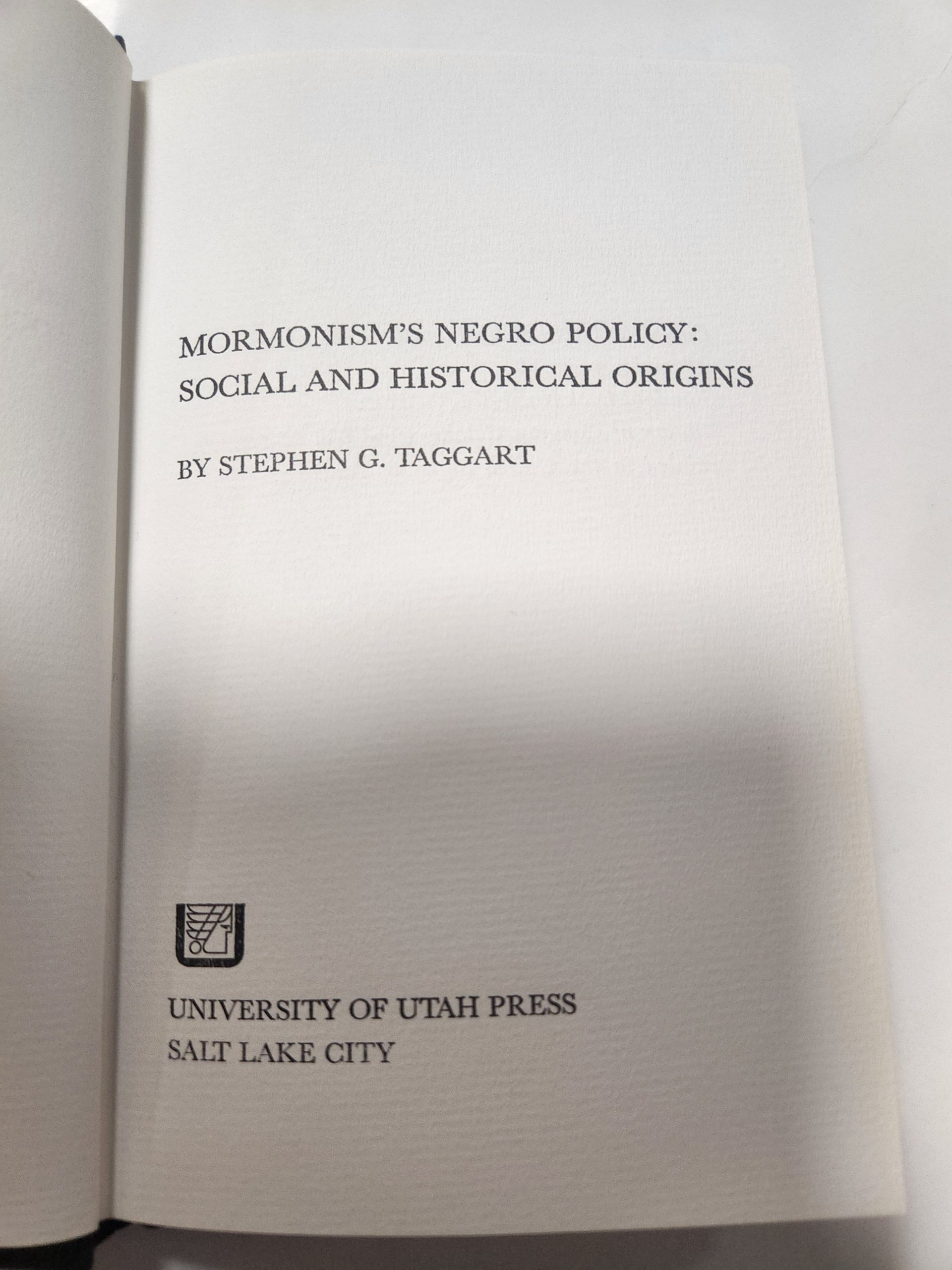 Mormonism’s Negro Policy: Social and Historical Origins by Stephen G. Taggart (hardcover, no dust jacket, 1970) No markings, firm binding, a few dings and scratches on cover.