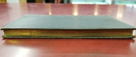 Brown leather; very ornate gold decor around the inside of each board, around the yellow paste down end sheets; also has matching light yellow free end sheets; also the page edges are all gold-leafed.
