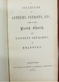 A Collection of Anthems, Introits, Etc., Used in the Parish Church, and District Churches, of Bradford. Bradford: Printed by Henry O. Mawson, Kirkgate, 1860. 103 pages.