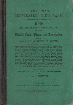 Hamilton’s Celebrated Dictionary, Comprising an Explanation of 5,500 Italian, French, German, English and Other Musical Terms, Phrases and Abbreviations, also a Copious List of Musical Charaters, such as and found in the works of Adam, Aguado… with additions from the Works of the Latest Foreign Authors, by J. A. Hamilton. Published by S. T. Gordon and Sons, New York, 1860. 190 pages. Hardbound; green boards with black spine; binding is loosening, but overall the book is quite good.
