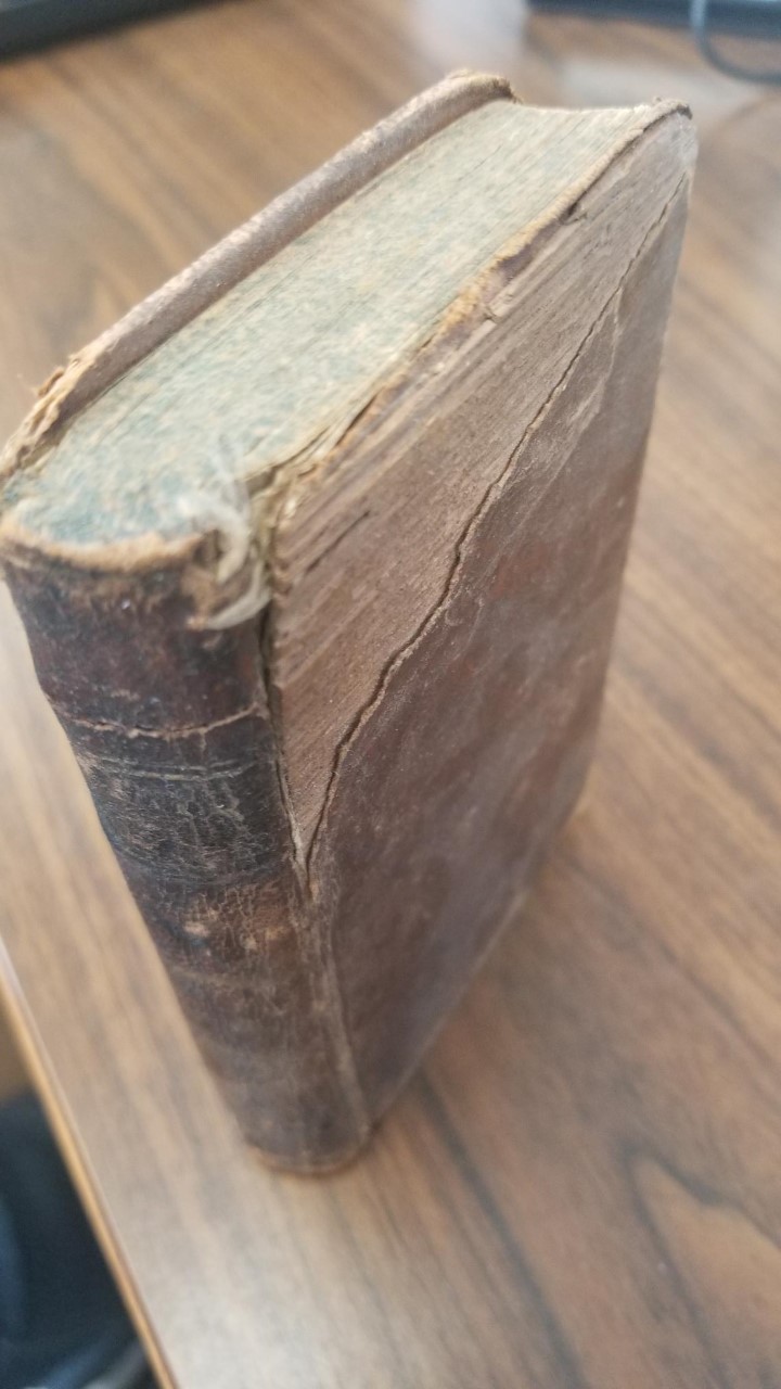 This little book is only 5 inches high. It is bound in brown leather, but the leather has been worn or torn off the top part of the front cover, revealing the wood underneath the leather.
