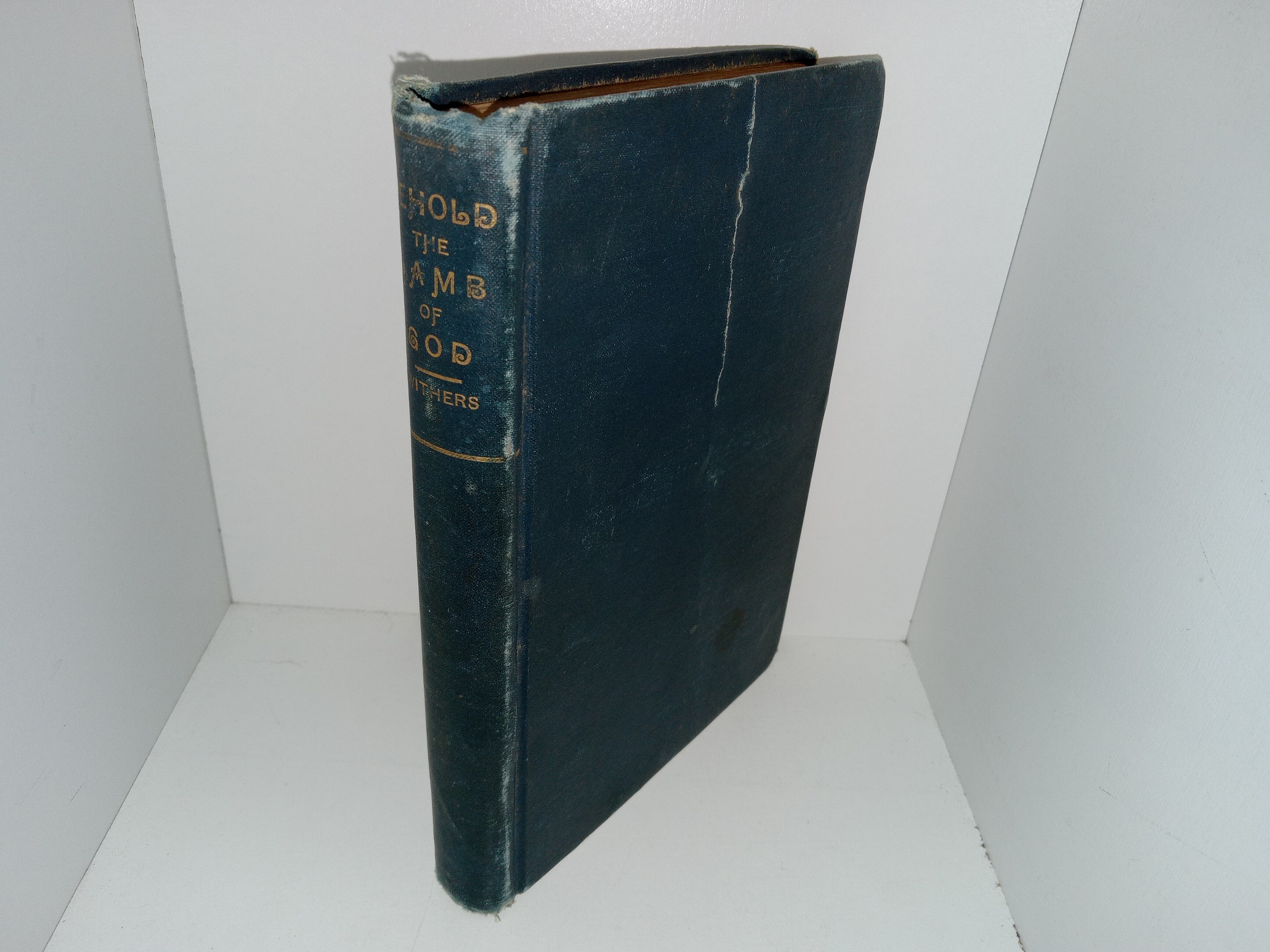 Fair condition, dark teal hardcover with no dust jacket. The cover has heavy scuffing, fading, some stains, bent corners, some tears and fraying, and the front cover has a crack that doesn’t go through the surfaces of the board, going almost halfway down from the top. Some pages have stains and creases. The front inside cover has writing in pen. The front flyleaf and second flyleaf both have writing in pencil and eraser marks.