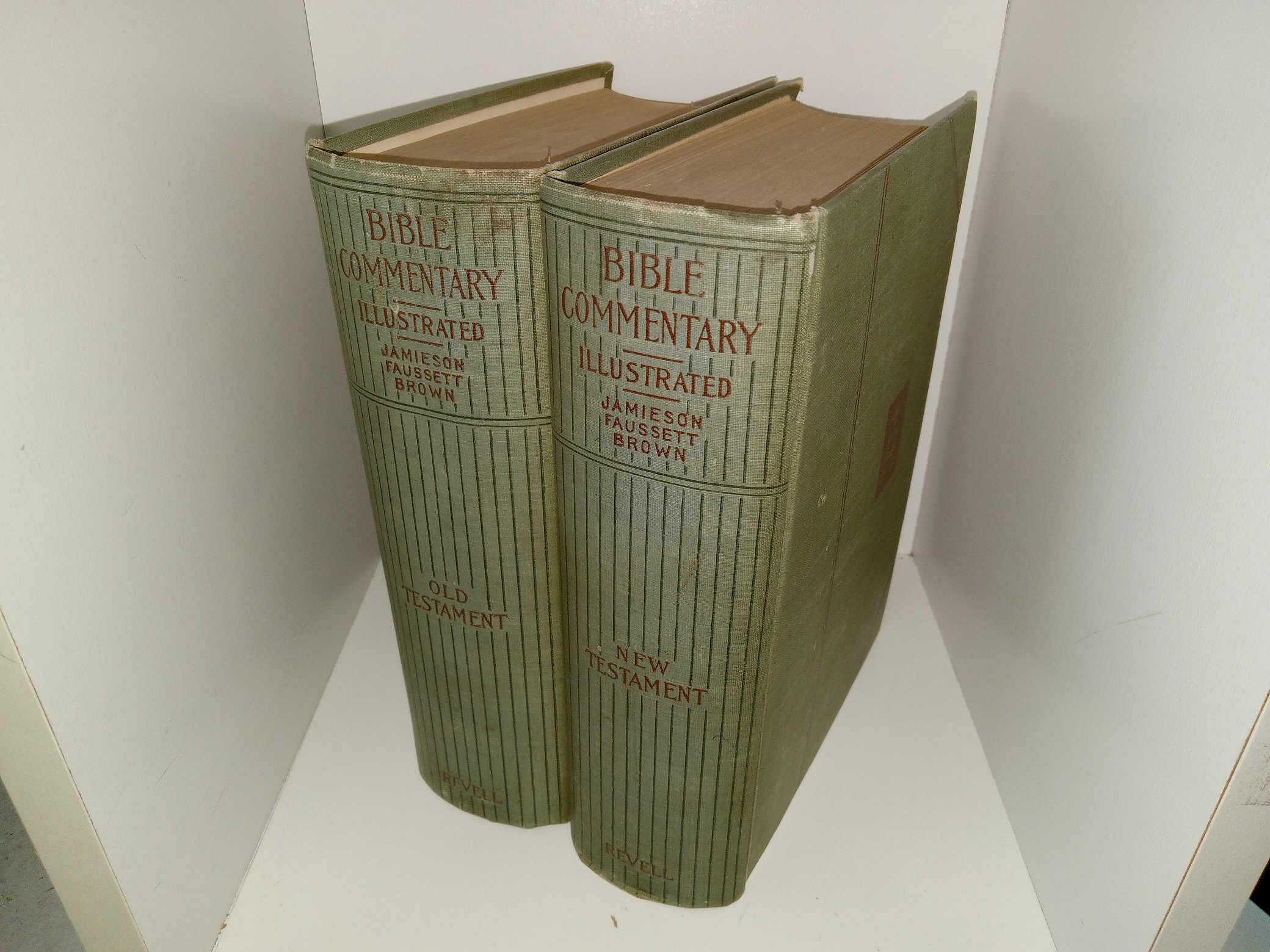 2 fair condition, very thick, green hardcovers with no dust jackets. The covers have scuffing, some stains, and some fraying at the corners. The internal bindings are torn and slightly loose. The front flyleaves have writing in pencil and eraser marks. Text throughout is clean, clear, and legible.