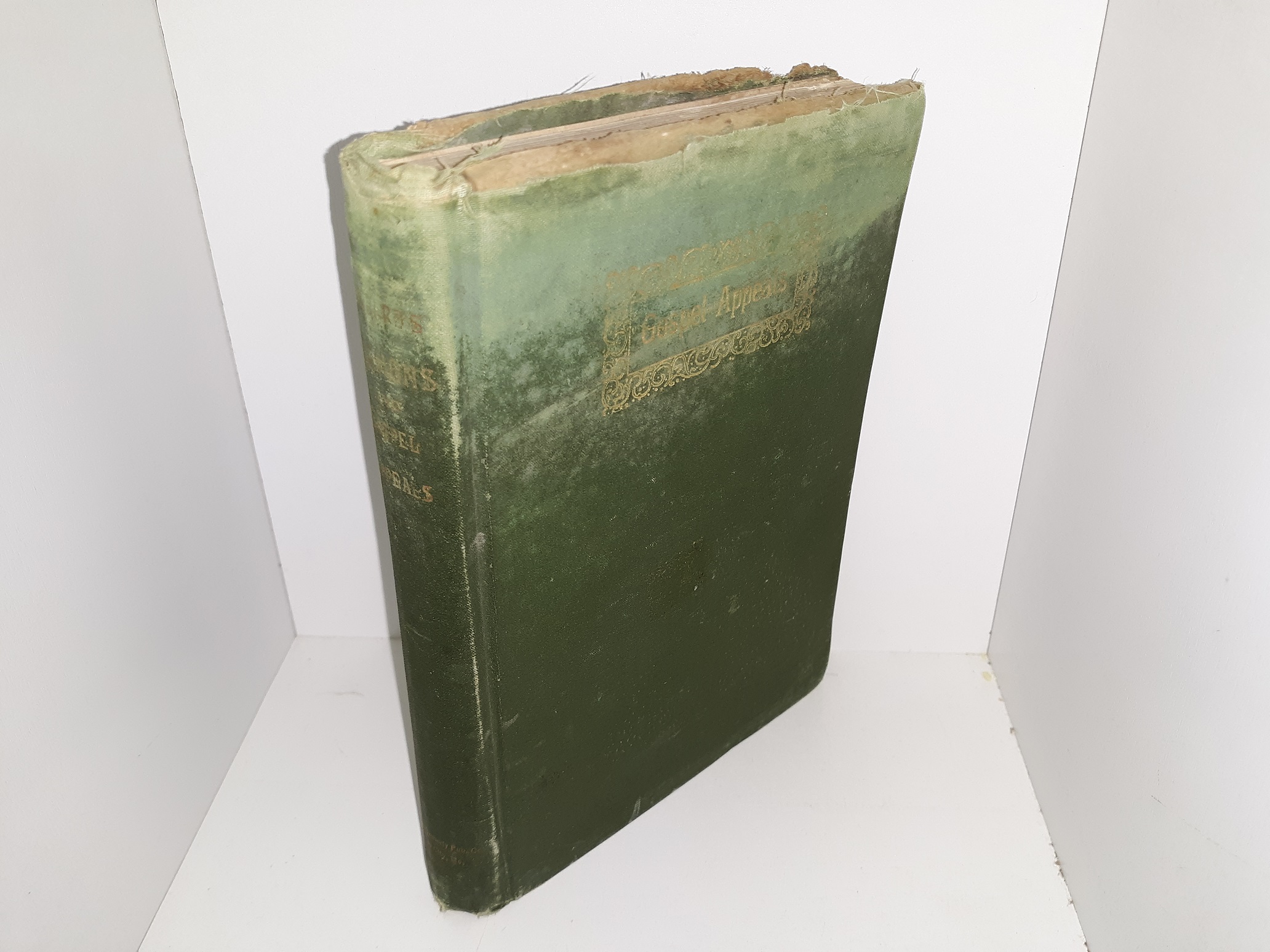 Fair condition, green hardcover with no dust jacket. The book is warped. The cover has heavy fading, scuffing, tears, fraying, large pieces torn off, and bent corners. The internal binding is torn and slightly loose. There are stains throughout the book. The front flyleaf has writing in pencil.