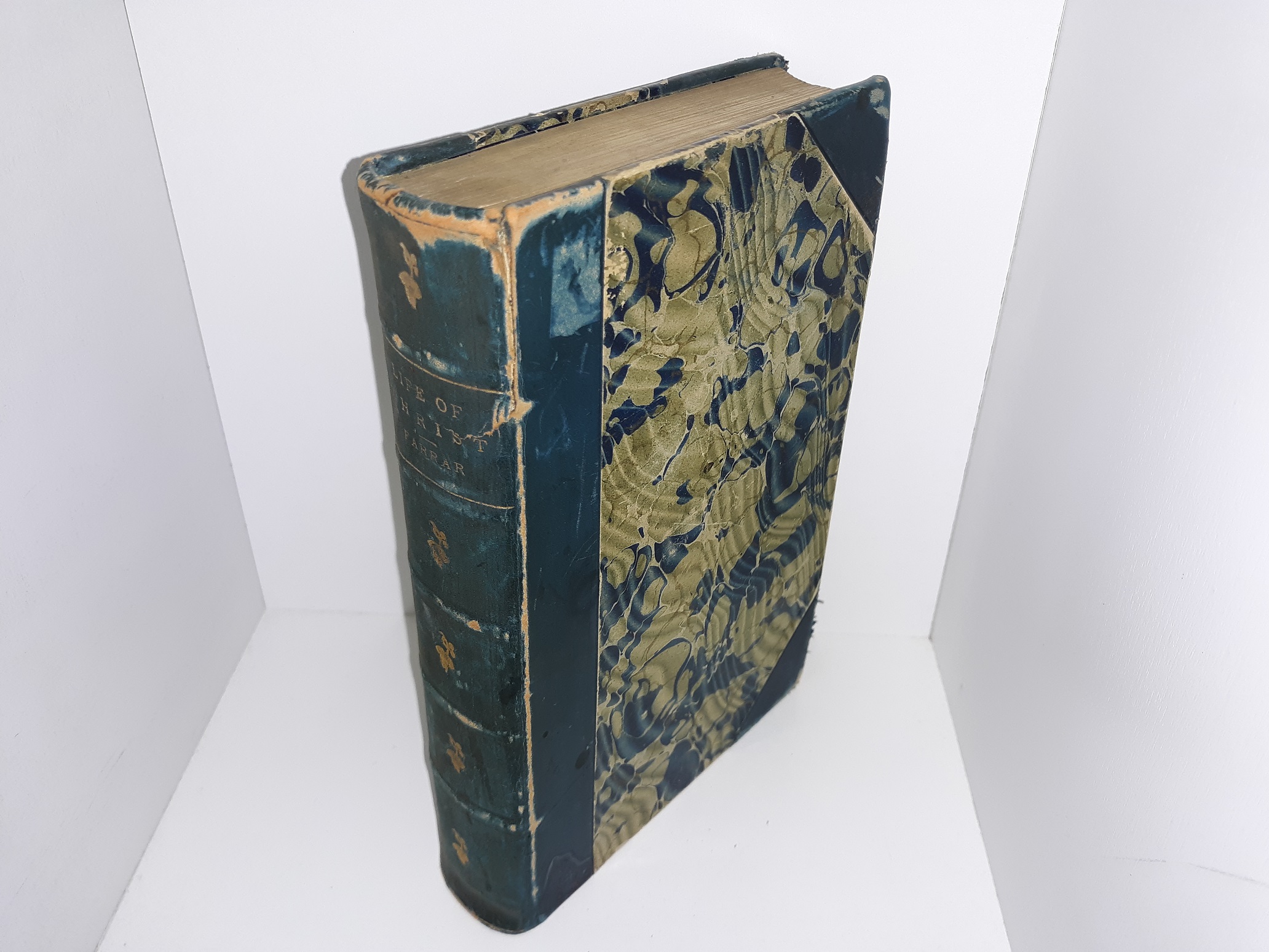Fair condition, 3/4 leather book. The cover has tears, peeling, fraying, scuffing, and some stains. The internal binding is torn and loose. The inside covers and flyleaves have some stains. The edges of a couple pages have small stains. Some pages have wrinkling. Text throughout is clean, clear, and legible.