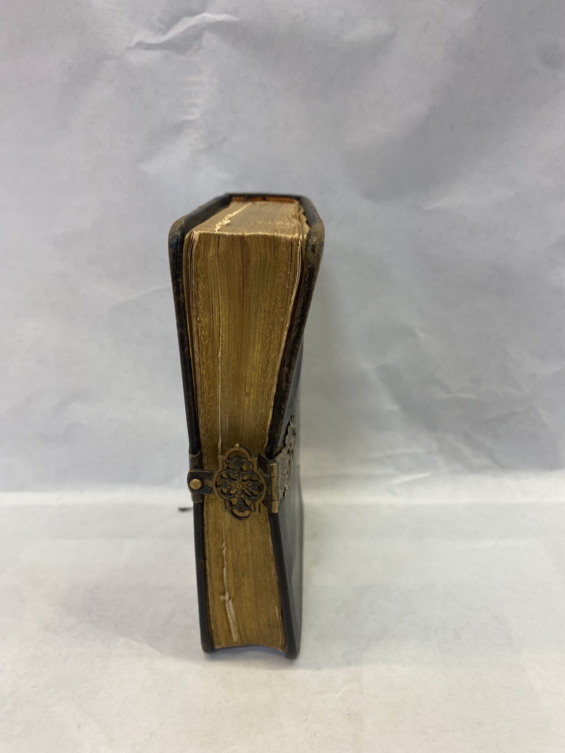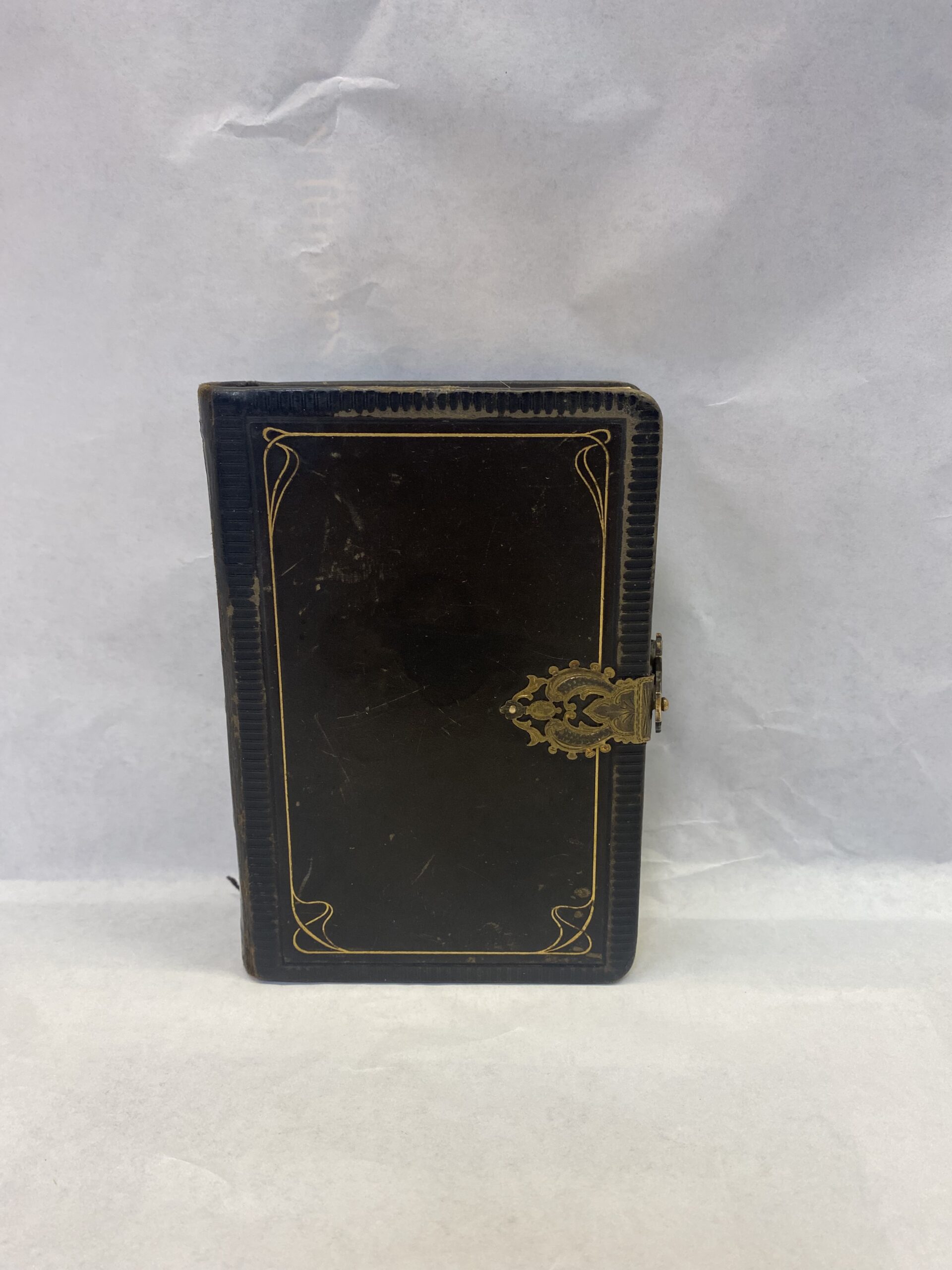 Acceptable condition. The book is heavily bent and creased. The cover has scratches, smudges, scuffs, some fraying, and mild stains. The pages are warped and bent due to water damage, with some staining, discoloring, and smudges. The edges of the pages are majorly scuffed with some scratches and smudges. The book comes with a metal clasp.