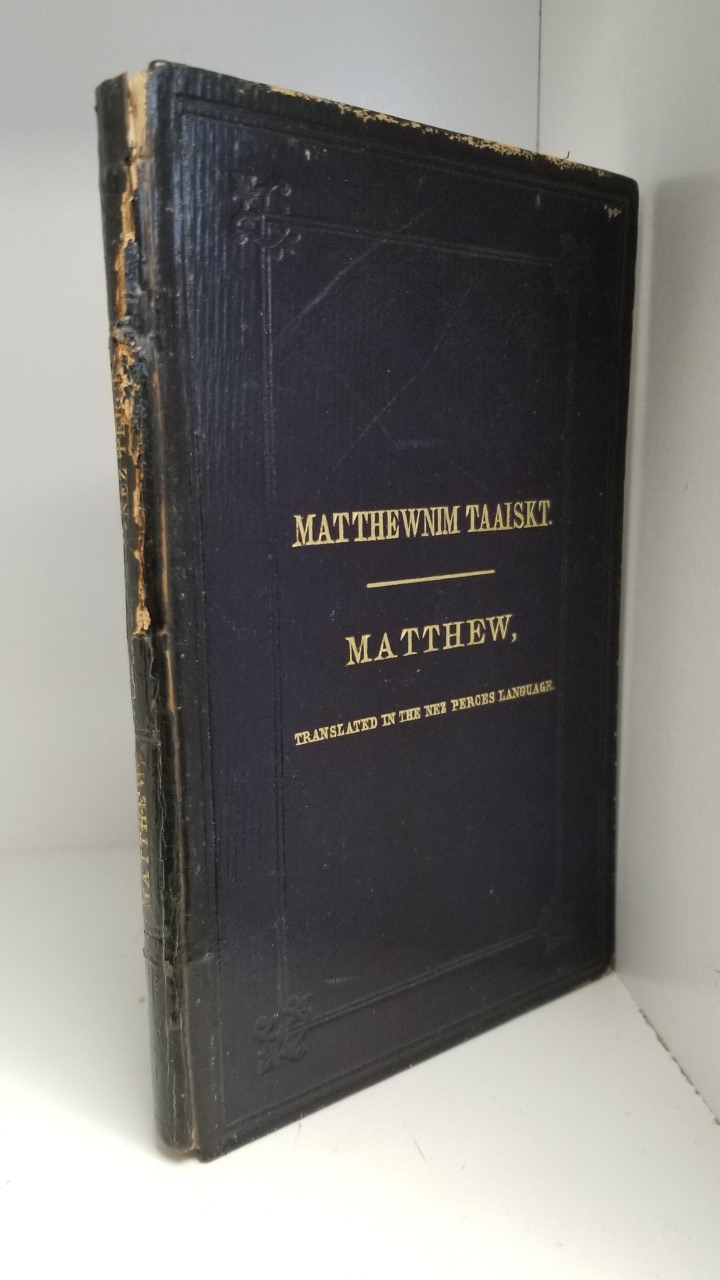 1871 Matthewnim Taaiskt. Matthew, Translated in the Nez Perces Language. American Bible Society: New York, 1871. 130p. Black leather binding with gilt title on cover; very clean pages inside text. Some old interesting ink inscriptions inside front of book about the Lapwei Mission and Spalding; also an old newspaper clipping about the scarcity of these books in the Nez Perce Language. Unfortunately this volume is cracked all the way down the spine, but could be repaired. A Very rare book indeed, a Nez Perce Language edition of Matthew from the Holy Bible. Also inscribed inside the front cover is “J. H. Trumbull, Dec. 26, 1871.” Fascinating book, and very very scarce!