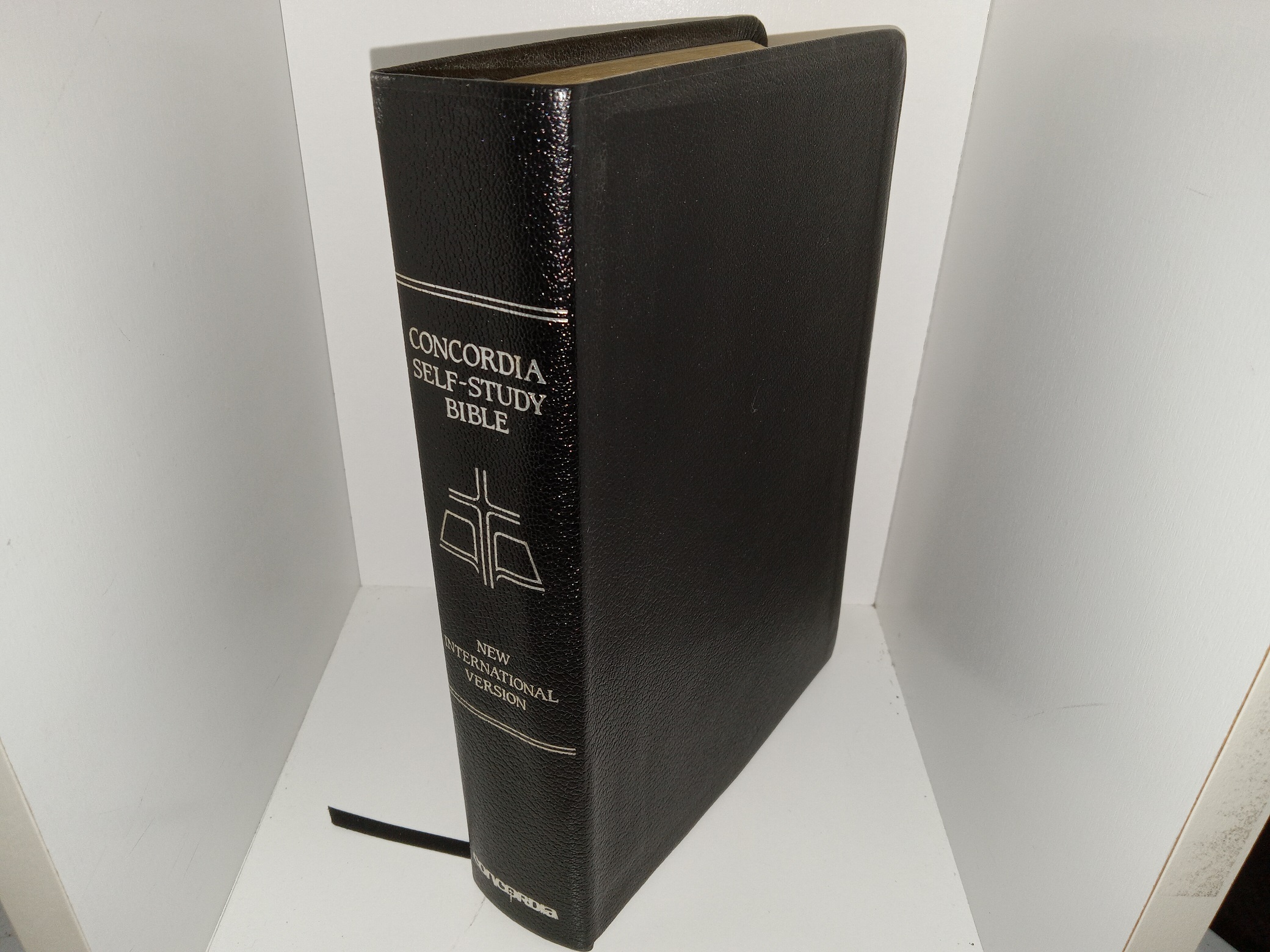 Good condition, black, leather-bound book. The cover has no visible wear. Some pages have creased corners. The first page has writing in pen and pencil. Text and illustrations throughout are clean, clear, and legible.