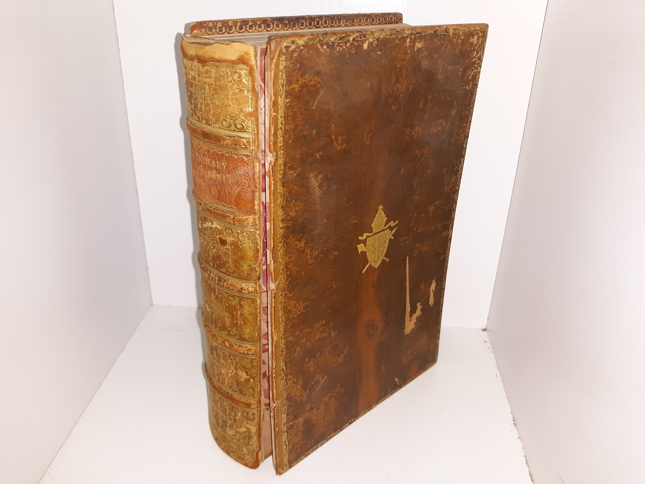 Fair condition, brown, leather-bound book. The front board is torn from the binding, but is still included. The cover has scuffing, fading, tears (especially on the edges of the spine), peeling, and some pieces torn off the top of the spine. The front inside cover has a large sticker. The flyleaves have stains. The second flyleaf has inscriptions written in pen and pencil. Text and illustrations throughout are clean, clear and legible.