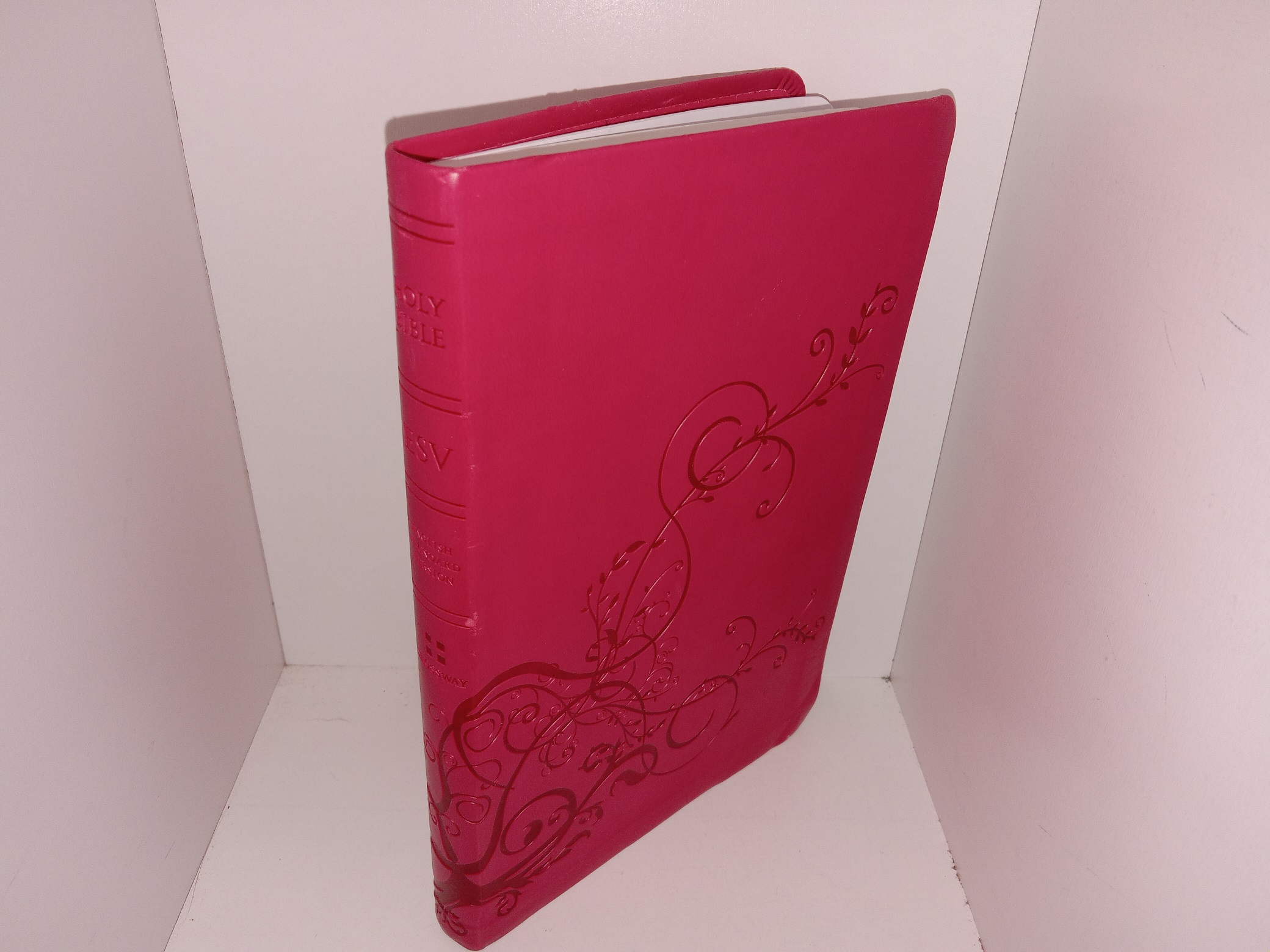 Good condition, pink, leather-bound book. The cover has some scratches, a small stain, and a slightly crushed corner. The second flyleaf has writing in pencil. Text throughout is clean, clear, and legible.