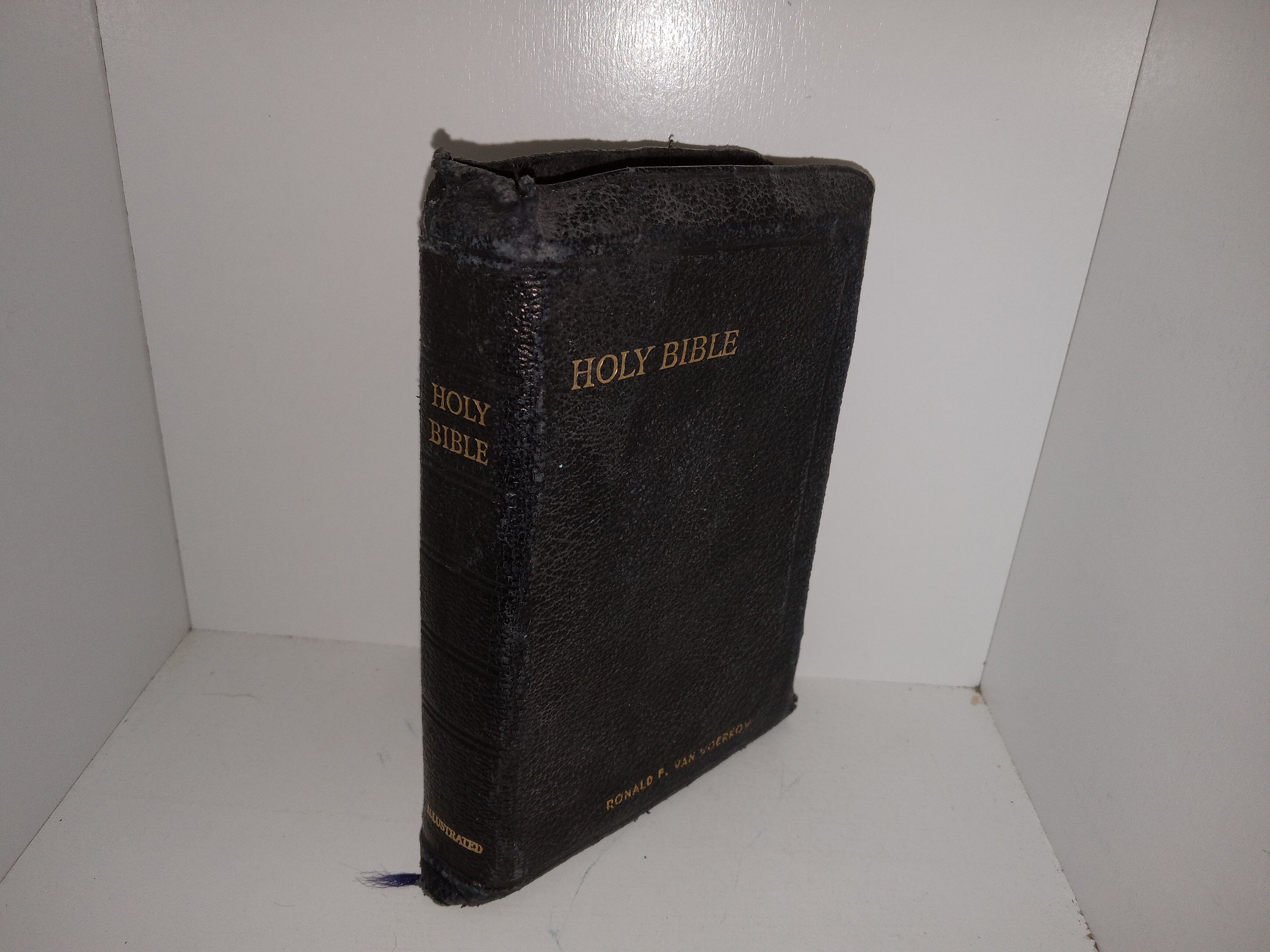 Fair condition, small, black, leather-bound book. The cover has scuffing, small tears, fraying, and some peeling. The ribbon bookmark is frayed. The inside covers have tears and pieces torn off. The 2nd flyleaf has writing in pencil, and eraser marks. The internal binding has a tear, and some tape. Some pages have scuffing on the edges, or creases. Text throughout is clear and legible.
