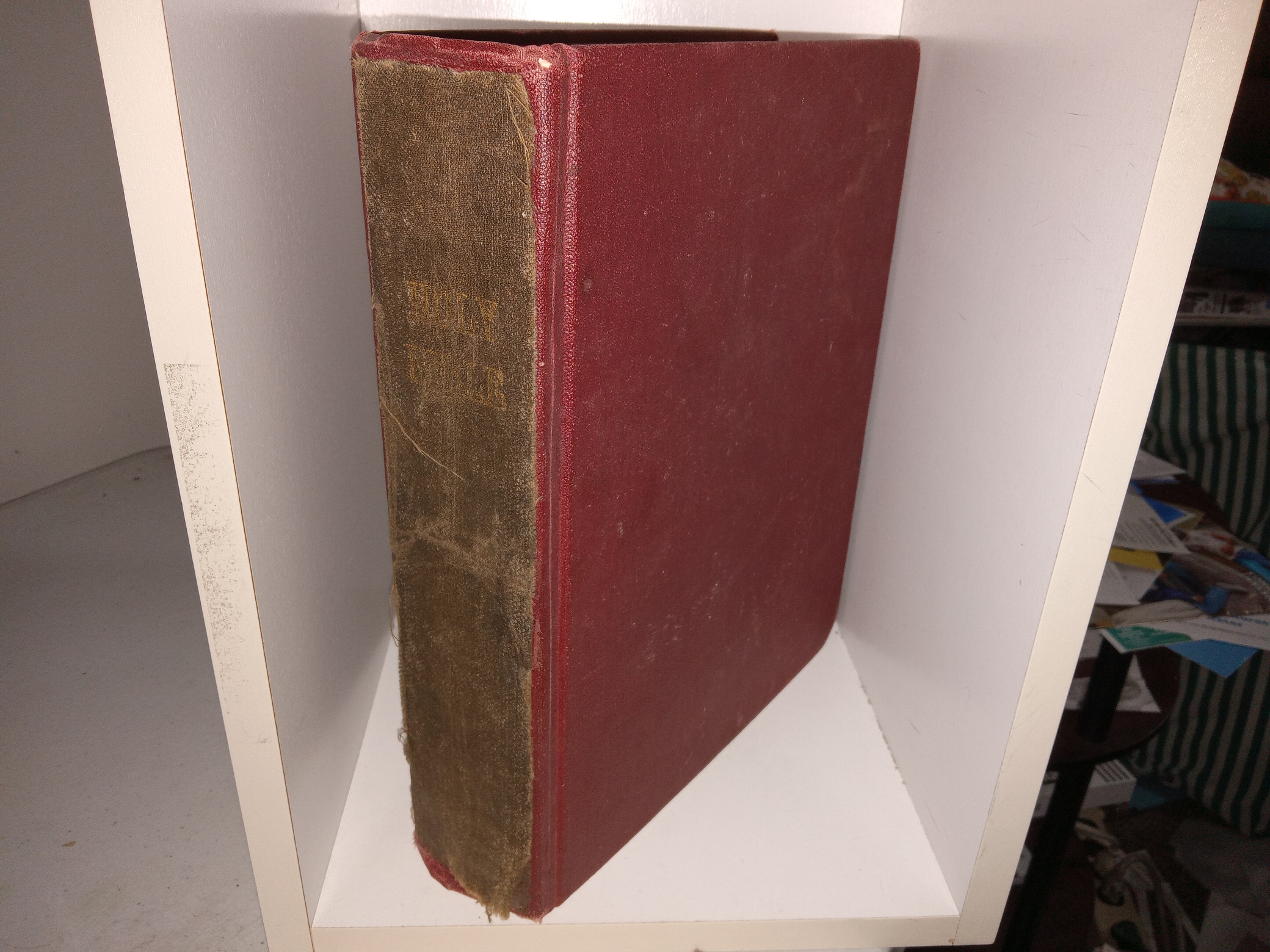 Fair condition, large, thick hardcover with the covering of the original spine attached to the new spine. The cover has scuffing, fading, small tears, fraying, and some tiny pieces torn off. The pieces attached to the spine have heavy scuffing, fading, fraying, tears, and pieces torn off. `Some pages have stains, marks, underlining, or writing in pen, creases, or wrinkling. The front flyleaf has writing in pen and pencil, and eraser marks.