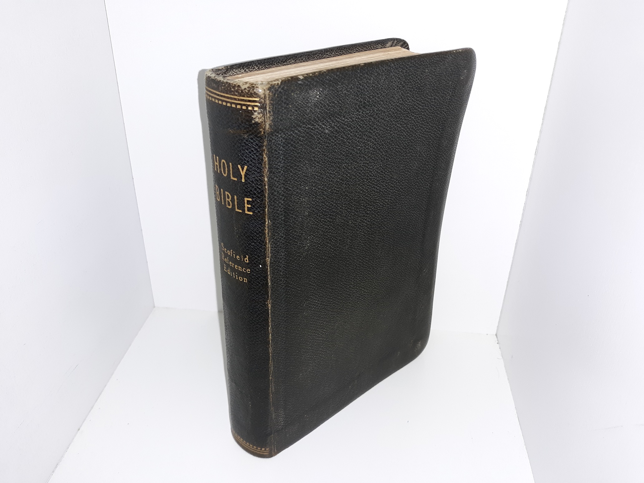 Fair condition, black, leather-bound book. The cover has some scuff marks and fading. The first several pages have notes written in pen. The second page has writing in pencil. Some pages have tiny stains. There is underlining written throughout the book in pen.