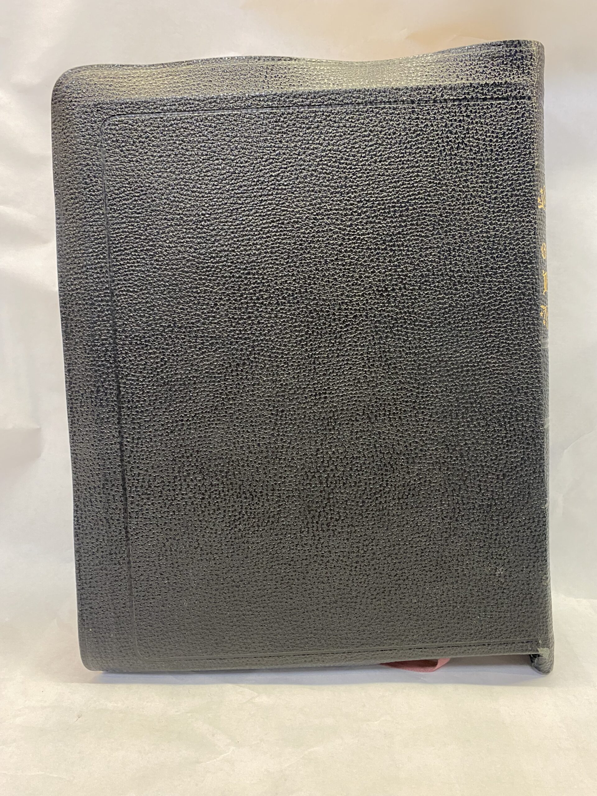 Acceptable condition. The cover is very worn with tearing, scuffs, scratches, smudges, and bending at the edges. Some of the pages have creases and smudges, one page has a dog eared corner, but the rest of the pages are clean and unmarked. The edges of the pages have smudges, scratches, and residue. The ribbon bookmark is creased and frayed at the edges.