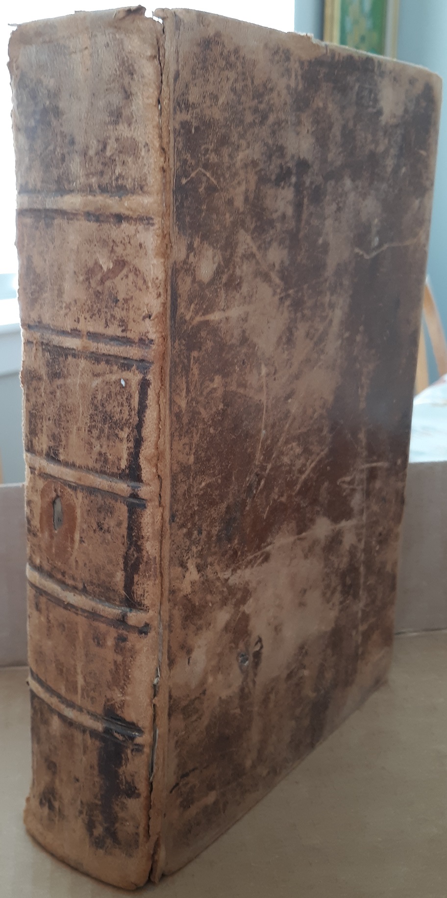 Fair condition, thick, brown, leather-bound book. The cover has scratches, scuff marks, fraying, fading, stains, and a long tear along the spine. The internal binding is also torn. The inside front cover has some pen writing. The cover page is creased, and has some writing in pencil. The pages throughout have some stains……………………………v1 Bx1267