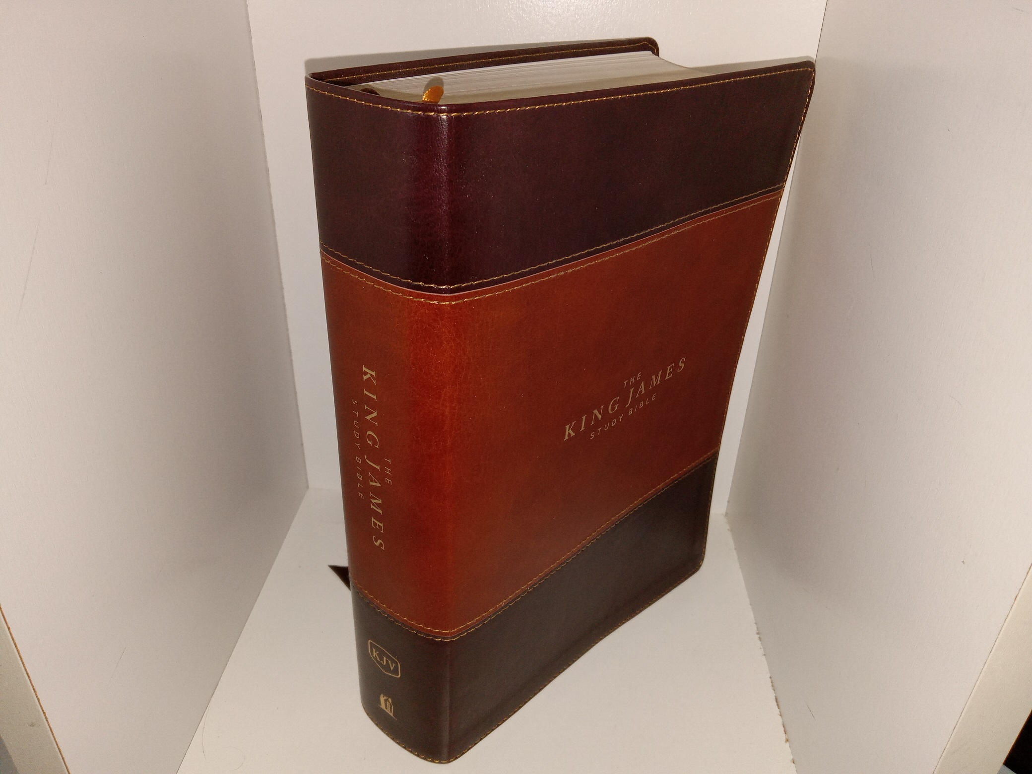 Fair-good condition, thick, black and brown, leather-bound book. The cover has no visible wear. Some pages have creasing, highlighting in marker, or marks or notes written in pen. The title page has writing in pencil.