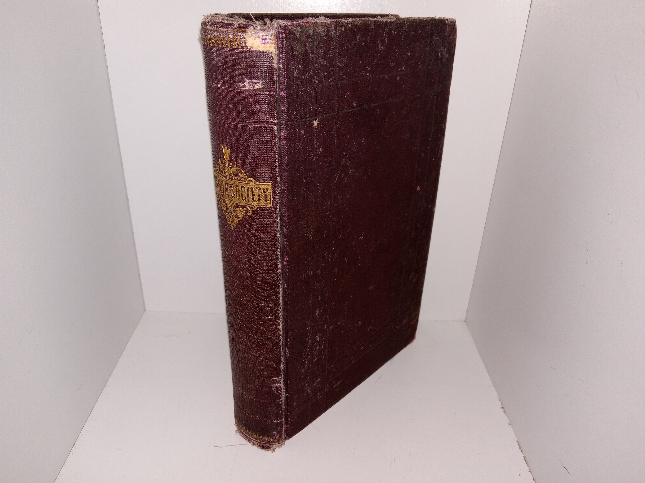 Fair condition, dark burgundy hardcover with no dust jack. The cover has some pieces torn off, tears, fraying, scuffing, and some bent corners. Some pages have creases, faint stains, scuffing, or indentations from metal bookmarks. The internal binding has some small tears. The front flyleaf has writing in pencil and eraser marks.