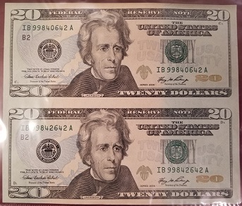 These two twenty dollar bills are uncut; look closely at the similar numbers on them!