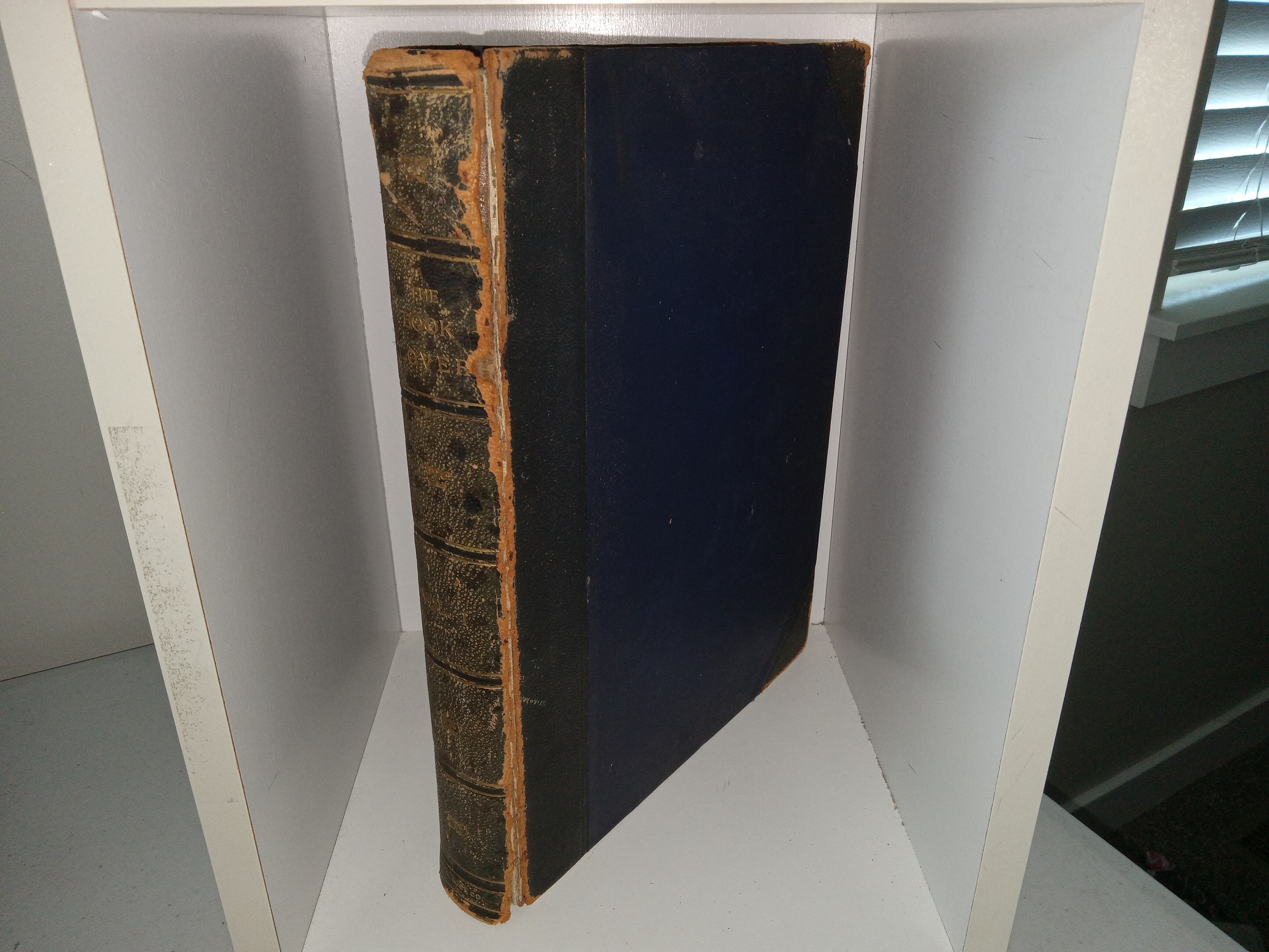Fair condition, large, black, 3/4 leather book. The cover has tears, fraying, scuffing, pieces torn off, scratches, and a torn patch on the back. The front flyleaf has a large sticker. The second flyleaf has writing in pencil and eraser marks. Some pages have creases, notes written in pencil, or stains in the margins, but the text throughout is clear and legible.