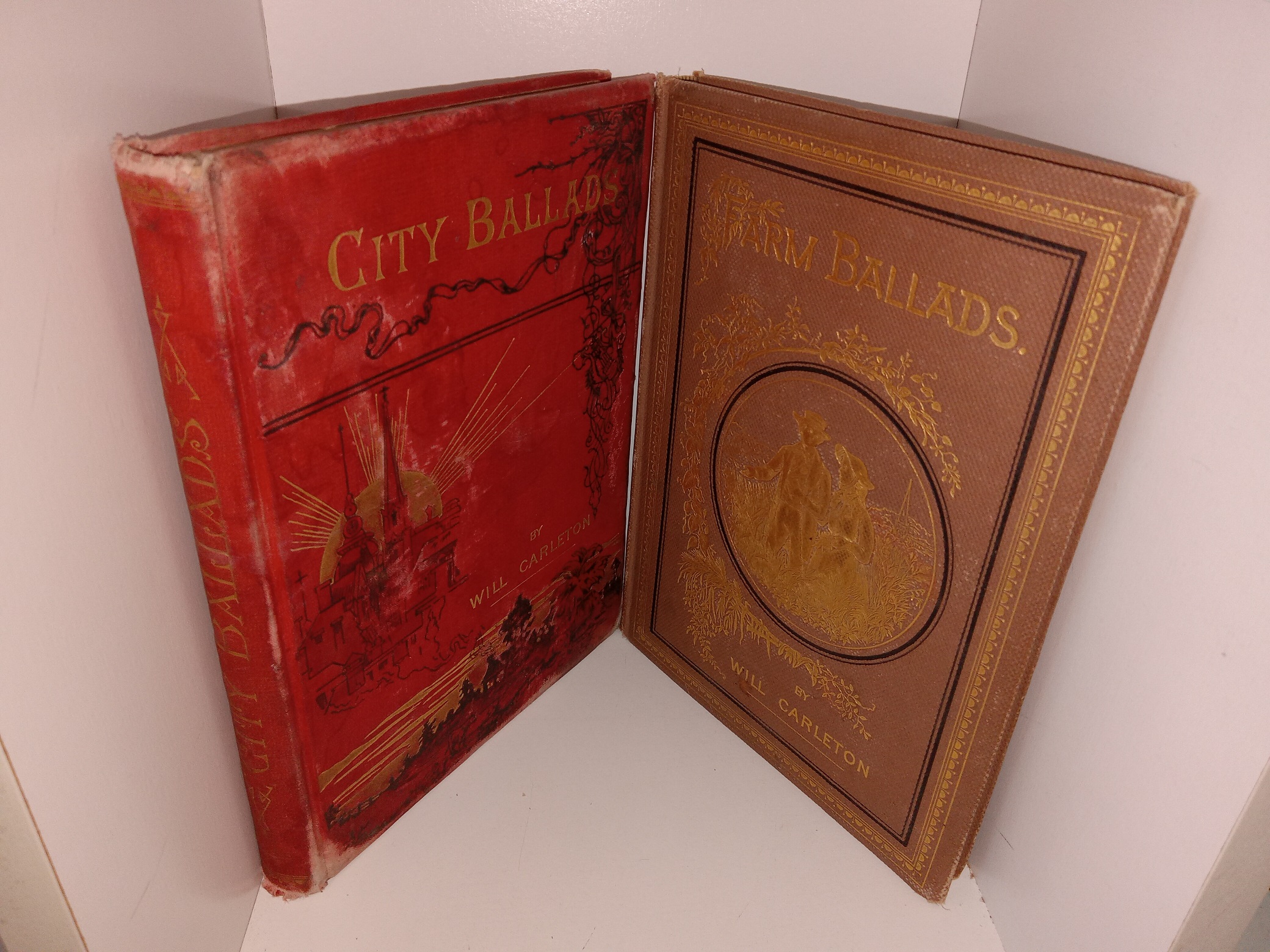 2 hardcovers with no dust jackets. City Ballads has heaving staining, fading, scuffing, tears, fraying, pieces torn off, and fraying on the cover. Farm Ballads has small stains, some tears, small pieces torn off, scuffing, and fraying. The internal bindings are torn and slightly loose. The inside covers and flyleaves have writing in pen and pencil, eraser marks, stains, scuffing, scratches, and tears. Some pages have stains or some small tears.