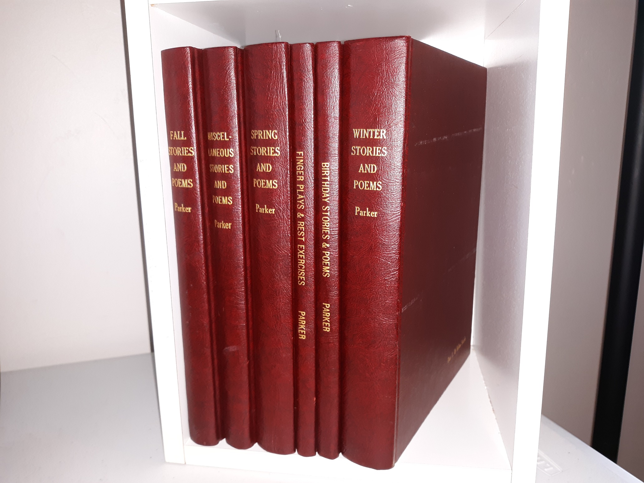 6 good condition, large, burgundy hardcovers with no dust jackets. The covers have the names of previous owners engraved upon them, scuff marks, and some wear and small dents at the edges and corners. The inside covers have scuff marks and might have some yellowing at the edges. The flyleaves have some writing in pencil. The title pages may also have some discoloration. Text and illustrations throughout are clean, clear, and legible.