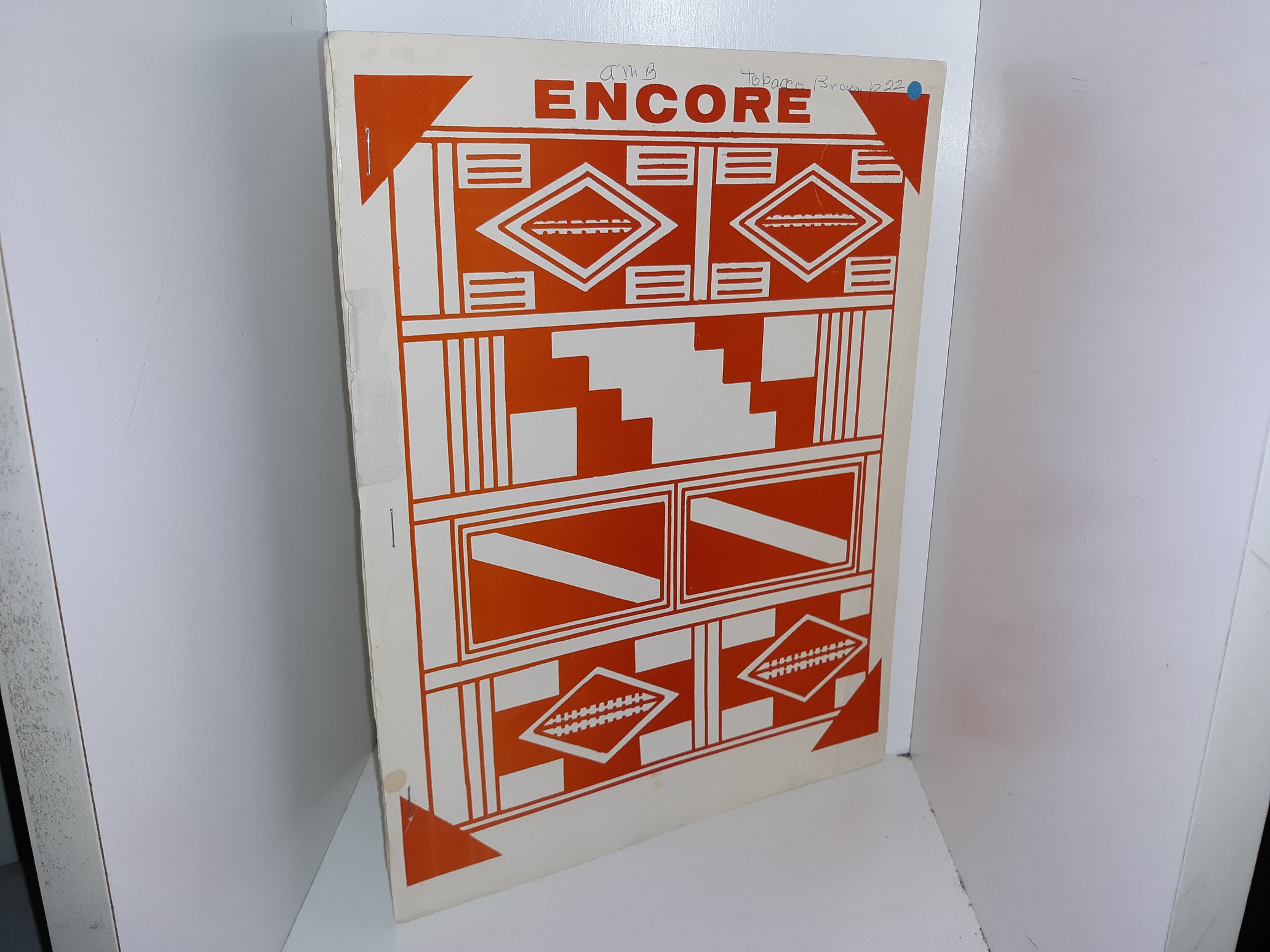 Fair-good condition, large, thin, staple-bound, softcover booklet. The cover has stains, tearing, writing in pen, a small sticker, some creasing, and some wrinkles. The first page has writing in pencil. Text and illustrations throughout are clean, clear, and legible.